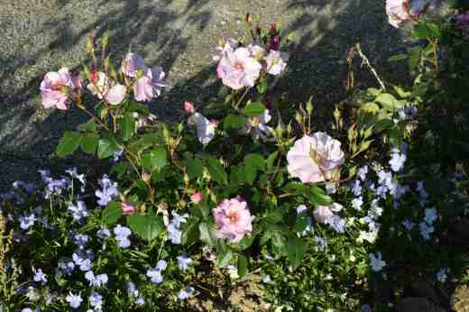 Three roses from the garden for this morning. First is ‘Odyssey’ which I am sure I have mentioned before. I planted a dozen of these in a narrow (1m) bed in front of the house. I have said before about how awful the soil is and how the plants struggled at first because of the soil and the nibbling of rabbits. Well they are through this now and are not just flowering but actually making decent growth, giving a hint of how they will be in the future, a hedge of fragrant roses. They are underplanted with perennial violas in blue, which is probably a mistake because they make the roses look pinker than they really are. ‘Odyssey’ (FRAnski) was introduced in the UK in 2001 and is an elegant rose with almost single, lilac flowers. They have a decent fragrance and it is the stamens that make it so special. It has repeated all summer and, so far, there is no sign of disease.