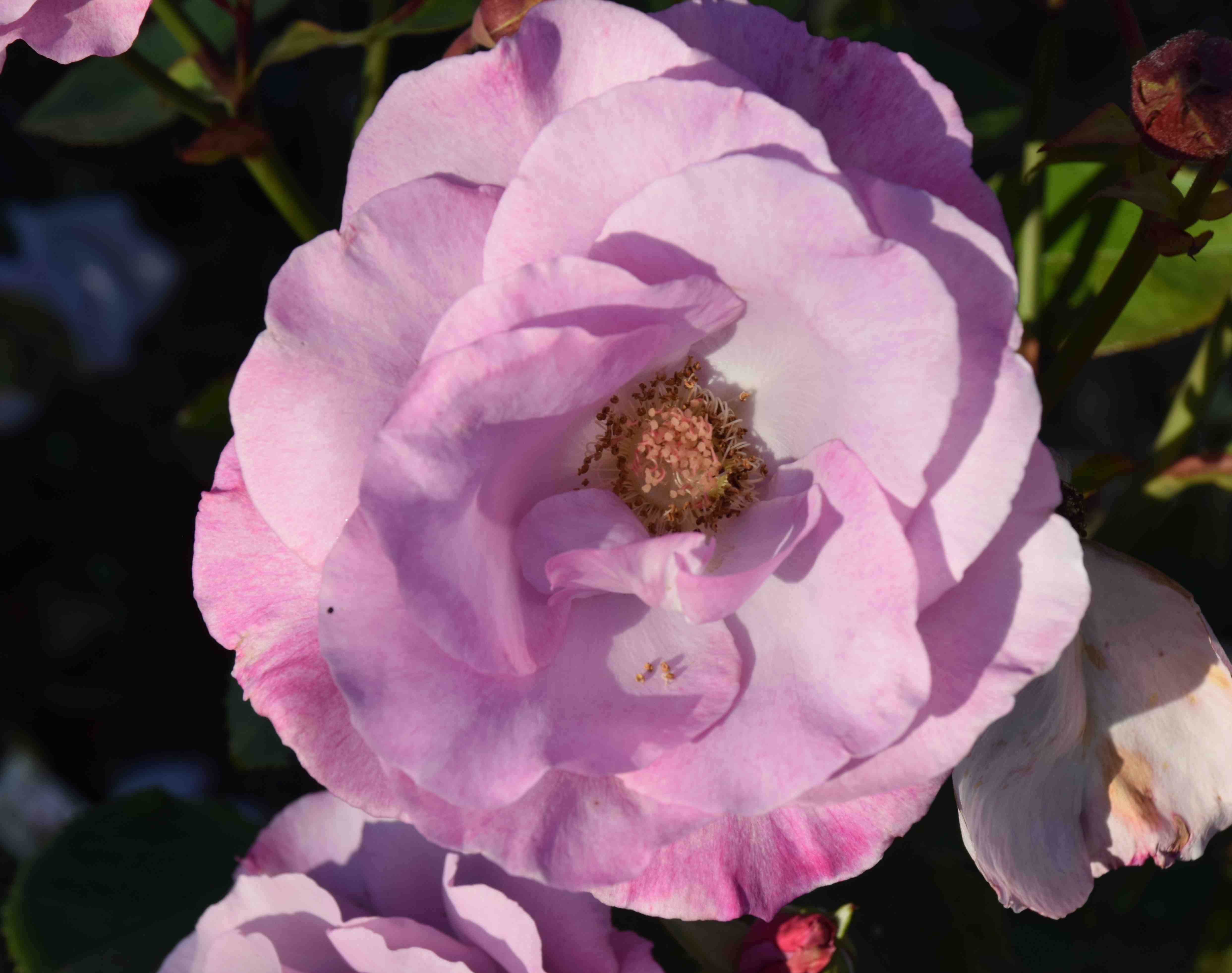 Three roses from the garden for this morning. First is ‘Odyssey’ which I am sure I have mentioned before. I planted a dozen of these in a narrow (1m) bed in front of the house. I have said before about how awful the soil is and how the plants struggled at first because of the soil and the nibbling of rabbits. Well they are through this now and are not just flowering but actually making decent growth, giving a hint of how they will be in the future, a hedge of fragrant roses. They are underplanted with perennial violas in blue, which is probably a mistake because they make the roses look pinker than they really are. ‘Odyssey’ (FRAnski) was introduced in the UK in 2001 and is an elegant rose with almost single, lilac flowers. They have a decent fragrance and it is the stamens that make it so special. It has repeated all summer and, so far, there is no sign of disease.