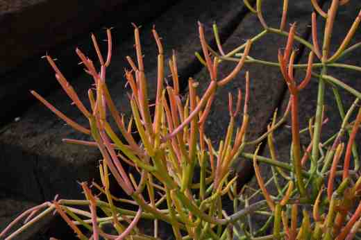 This has become very popular for the striking foiar color in landscapes in Southern California. The green form had always been around. It was known simply as ‘pencil cactus’.