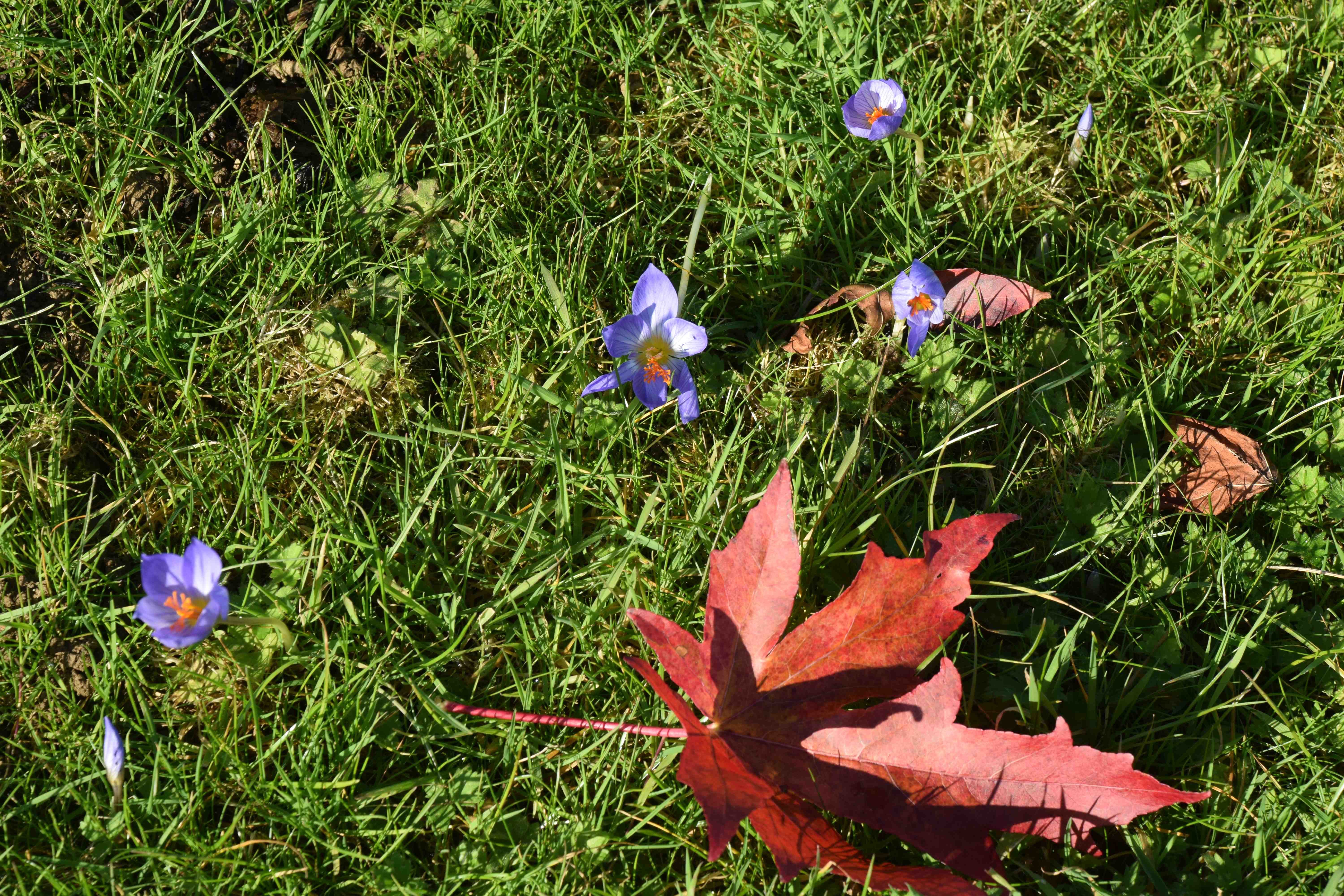 Quicker results come from autumn-flowering crocus. A month ago I planted 120 of what is supposed to be Crocus speciosus and its cultivar ‘Conquerer’ – you can never be quite sure with dried corms (or bulbs). I put most of them under my three new liquidambars. I love the lavender flowers popping up between the fallen, purple and crimson leaves. Crocus speciosus is the best autumn crocus for the garden and will naturalise in grass in a sunny or partly shaded spot. It is a far better garden plant than the more commonly available C. sativus, the saffron crocus, which needs a hot summer to bloom well. Crocus speciosus is native of Turkey to Iran where it grows at the edge of woodland and copes with cold winters and damp summers, the reason why it copes with the Irish and UK climate. The flowers are a bit later than normal this year, because they are newly planted. In successive seasons it will bloom a little earlier, but always after the majority of colchicums.