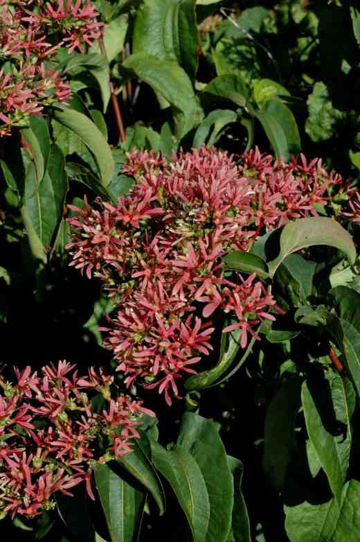 It has many distinctive features. In fact it is impossible to confuse it with any other shrub. Along the stems are pairs of elegant, long leaves that curl upwards along their margins but downwards along their length. They are deep green above, lighter below, and contrast with the gingery stems. It makes a distinctive foliage plant all summer. This would not be quite enough reason to get excited about it, even for me, so thankfully, in late summer, it produces flowers. These are carried in large heads, each made of clusters of seven blooms, at the ends of the current growth. There is some debate on how many flowers there actually are, the terminal one, subtended by two pairs of three, not being a flower at all but looking like a bud. I do not have a plant to check right now – you would have thought that botanists would be able to count to seven!
