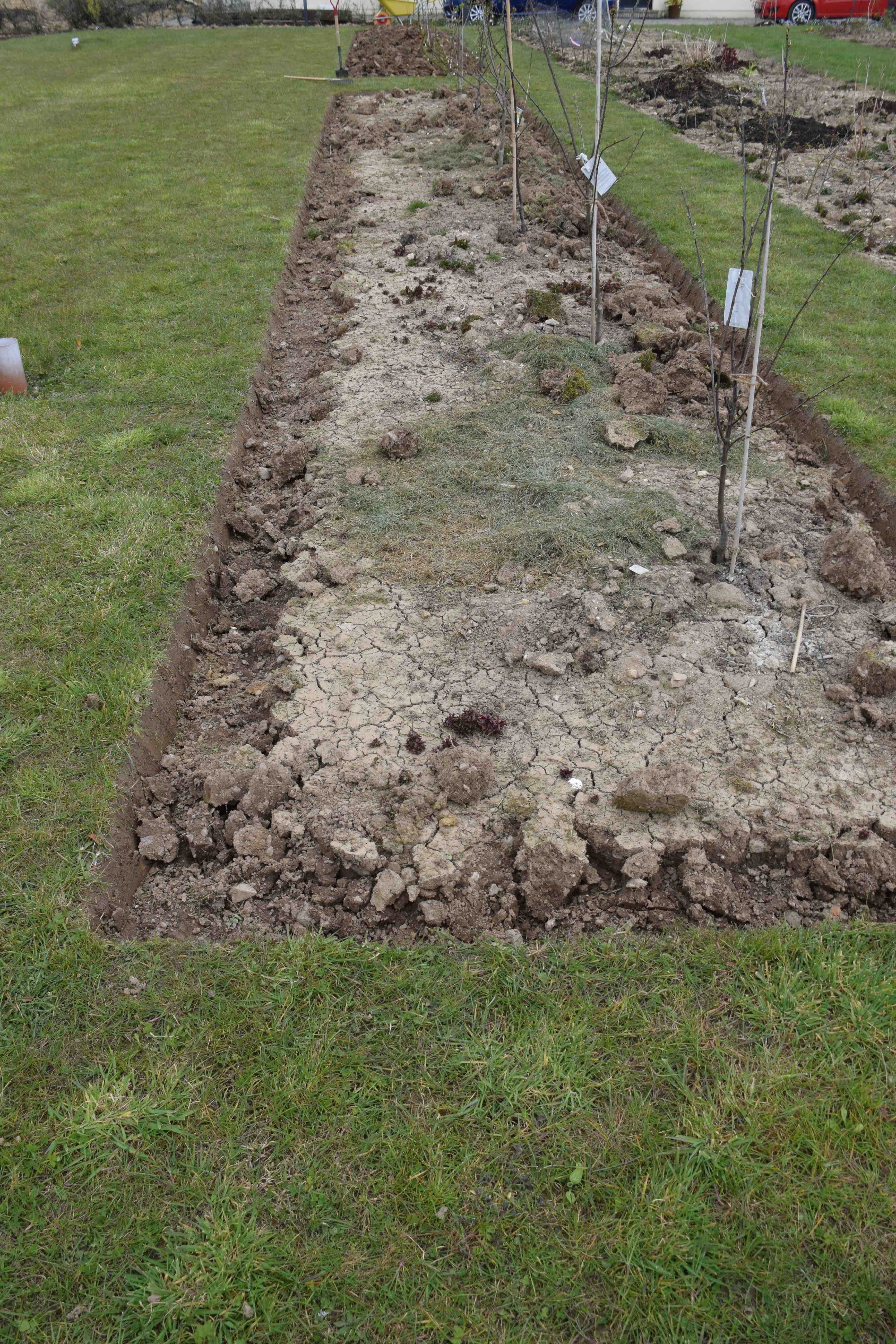 These two beds are where I planted some fruit trees. The apples are planted down the main drive so here are plums, pears and cherries. There are 11 trees, three pears, two cherries and six plums. The proportion of plums to pears does reflect which I like more, but also the diversity of plums. There is, as always a hiccough, because the nursery I ordered the fruit from confused my order for apple ‘Maribelle’ with plum ‘Mirabelle de Nancy’ – they offered both and I ordered the apple and got the plum. I will cope with it. I would plant more cherries since I like them the most, but they are big trees and, from experience, know that birds are better at picking them than me.