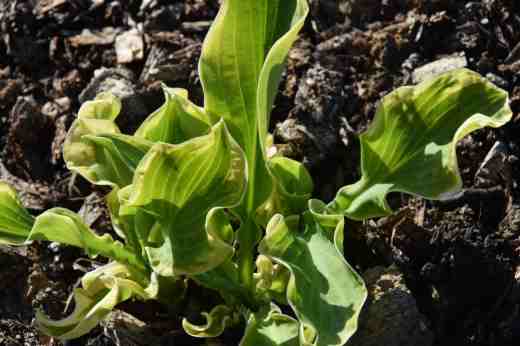 ‘Pizzazz’ which has a thin white edge so far but shows the lines and spirals that are part of the attraction of hostas in spring