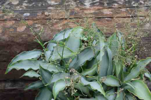 Rather than the more typical, hairless, shiny green leaves this cultivar has metallic, grey leaves with a broad, silver stripe down the centre. It has proved a very tolerant houseplant. I allow it to dry out slightly and the leaves become slightly less turgid but watering then perks it up and it has shown virtually no brown leaf tips. It produces stems of flowers from the centre of the leaf clusters but these are nothing to get excited about. In fact they are a bit of a nuisance. Like most of its relatives, the flowers only last a day. They open in the afternoon and, though white and triangular they are tiny. I mean really tiny. They make nettle flowers look spectacular. And after a few hours of glory they twist up, go brown and drop off. The windowsill is full of them because each branched cluster comprises hundreds of them. I will have to grasp the nettle and pinch them off really – it would improve the look of the plant really. I am assuming it will root easily from cuttings. I just repotted it and broke off a stem so I will soon find out.