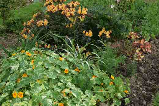 Alstroemeria ‘Indian Summer’ is a great plant. I like the subtle variegation of the dark leaves and the flowers are bright. It takes a light frost in its stride and it flowers on and on. It made the basis of a planting including the old variegated day lily, Itoh Peony ‘Bartzella’ (which flowers much earlier of course), a kniphofia (that is yet to show flowers), heuchera ‘Ginger Ale’ and a torrent of variegated nasturtiums. I know I will regret planting these – they will seed everywhere and plague me for years. But they are cheerful at the moment and attract cabbage white butterflies that keep the cat amused and fit.
