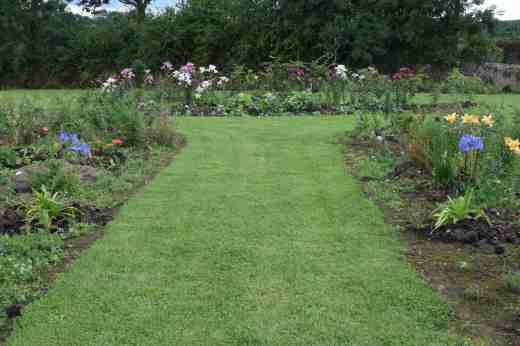 Following yesterday’s post about an area of the garden, today I am showing the main pair of borders down the garden from the house. As with other areas of the garden, some plants were put in last year and I did not get round to digging over all the beds till late this spring, incorporating lots of compost. This allowed lots of new planting. Some are perennials and there are lots of annuals. The beds are about 2.5m deep so shrubs will be put in the back and there are hornbeam hedges down the back of each though these are still small, being just 2 years old. I am looking forward to all the hedges growing so the garden has more structure – but not the trimming.