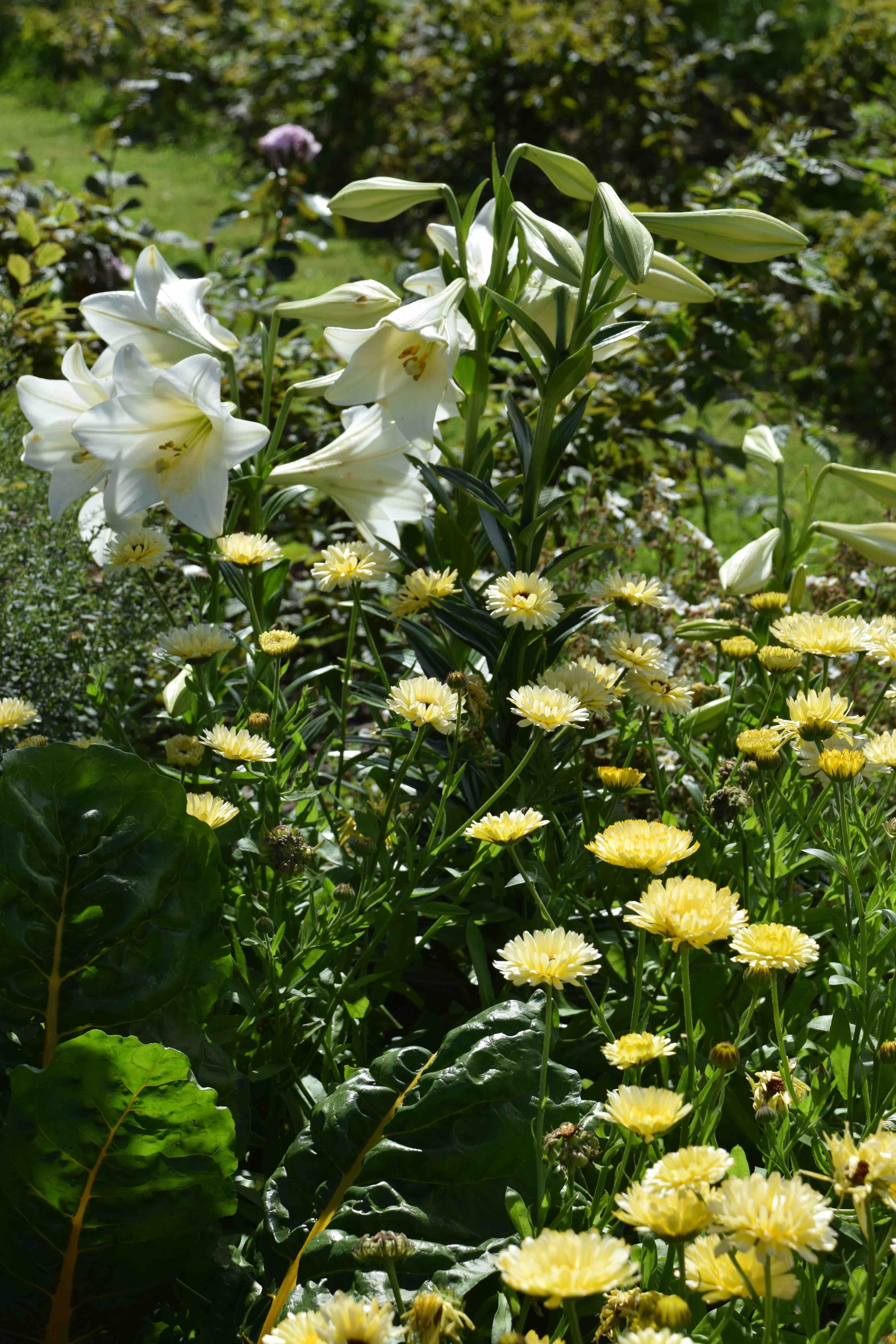 Another Longiflorum lily hybrid, seen here with Calendula ‘Snow Princess’. The calendula is not as white as advertised and is palest just as the flowers fall to bits but it is a pretty thing. I posted before about its rangy habit, which surprises me since most modern varieties are dwarf. I think this is more by accident than design – I suspect the raisers were so obsessed by the novel colour that they did not have time to make it more compact. I would like it a bit shorter if I am honest – it is 60cm high – but it is making a good show.