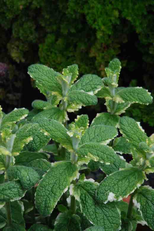 Leaves and stems are composed of layers of tissue. Leaves have more layers in the centre and fewer around the edge. When a mutation occurs that causes the outer layer of tissue to grow without chlorophyl, (the green pigment), the leaves have a white edge where there are no green cells (variegated mint above). But sometimes, the growing point bursts through the outer layer – like a finger pushing through a damaged glove – and the leaf or shoot grows without the outer layer of white tissue. The white tissue, because of its lack of carbohydrate-manufacturing chlorophyl, is a drain on the plant, having to be sustained but serving no purpose, so variegated plants grow less vigorously than all-green plants. If green shoots appear on variegated plants, because of their greater vigour they can ‘take over’. See the variegated euphorbia at top of page with two green shoots.