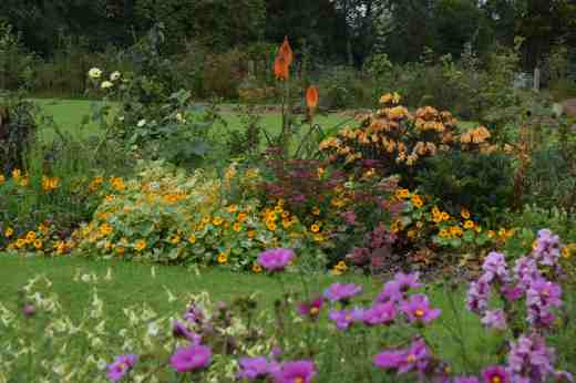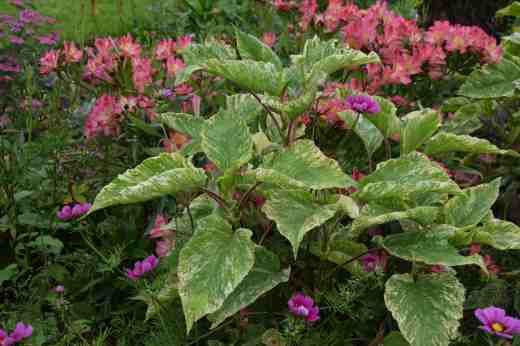 One that I fear is not going to make it before the frost is my ‘kiss me over the garden gate’ – Persicaria orientalis. This is not a common garden plant here though I think it is more widely grow in the USA. I am becoming curiously attracted to persicarias as I get older – I am not sure what this means – and this is an annual species with bold leaves and a bulky habit. It flowers late in summer with arching stems of deep pink flowers. This year, rather than the plain green, I have grown the variegated ‘Shiro-Gane-Nishi’. I guess it is not my favourite type of variegation but it does stand out in the garden. But there are no signs of any flowers at all so far. And that means I won’t be able to collect any seeds let alone enjoy it self seeding! In theory it should reach 2m high but, after the drought and then battering it has had this year I am happy for stumpy plants just 1m high. I am hoping for an Indian Summer so I get a glimpse of the flowers
