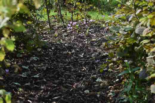 It was put there to make a ‘woodland’ bark path where I planned to plant cyclamen. I brought with me to the garden lots of seedlings of Cyclamen hederifolium from my silver-leaved plants, with pink and white flowers. It is always worth buying cyclamen in growth so you can select the leaf patterns you like best and then, in autumn and winter, you can look under the leaves and find lots of tiny seedlings that can be transplanted or potted to grow on and plant elsewhere. Most of my plants are thus two or three years old and were only put into the soil in spring this year, as they were dying down so they will need another season before they truly show themselves. But it is a start and I think the plan will work.