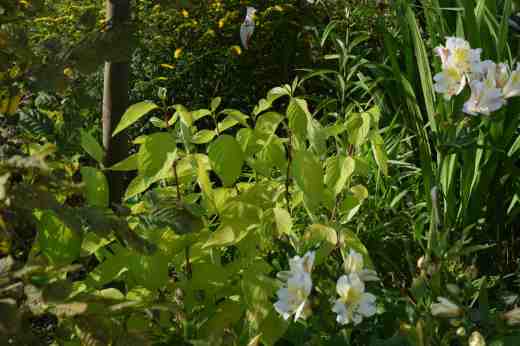 Returning to the yellow and white borders, Tanacetum pathenium ‘Aureum’, better known as golden feverfew, is looking nice just now. I realise that some will regard it as a rather weedy plant but I think it has its merits. For a start, the bright yellow leaves are very cheerful and it is one of the few yellow-leaved plants that is easy to grow and thrives in full sun (more of that later). It straddles being a herbaceous perennial and a shrub. In the first year it is quite soft but the base becomes woody by the first winter and it should be cut down to a woody stump in spring. After a year or two it gets a bit raggedy and is best replaced. Luckily, it seeds freely and the pale seedlings are easy to spot and leave, move or thin.