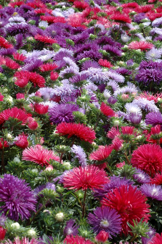 Asters are usually available in mixtures but look out for single colours too. The colour range encompasses pale yellow, apricot, champagne, white, pink, red, mauve and lavenders, purple and close to, but not, blue.