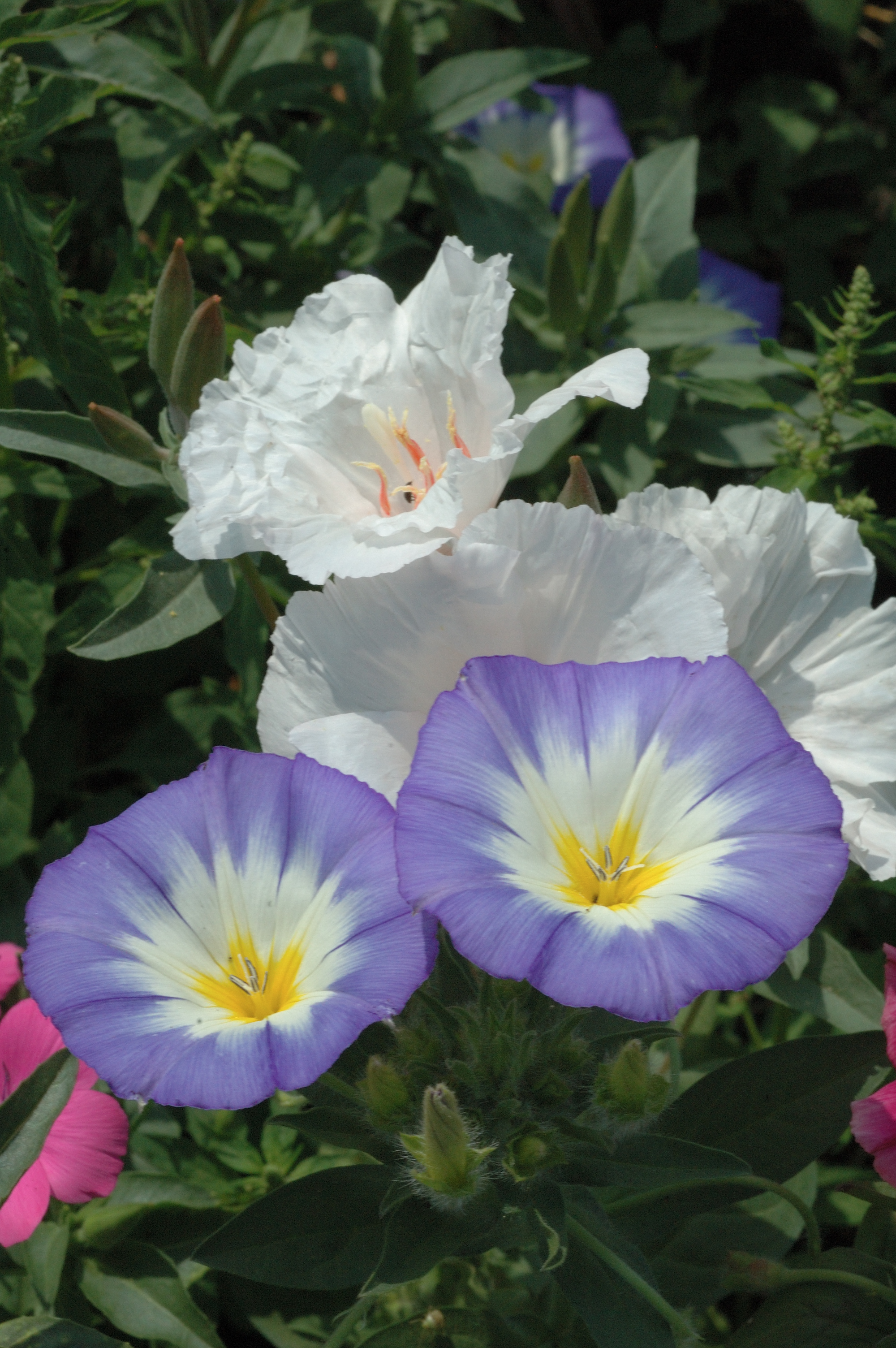 But I digress. Convolvulus tricolor has flowers with, your guessed it, three colours; blue, white and a yellow centre. Usually only available as a mix of two shades of blue, pink and white, the deep blue ‘Royal Ensign’ and ‘Blue Flash are sometimes available. The pinks are usually shaded with intense eye markings reminiscent of the fanciest, modern hemerocallis. Despite the clarity in the blue flowers I find the pinks strangely appealing. All are neat and pretty and, unlike so many annuals the plants remain in bloom for a very long time. They have no value for cutting unless you like replacing your vase every few days.