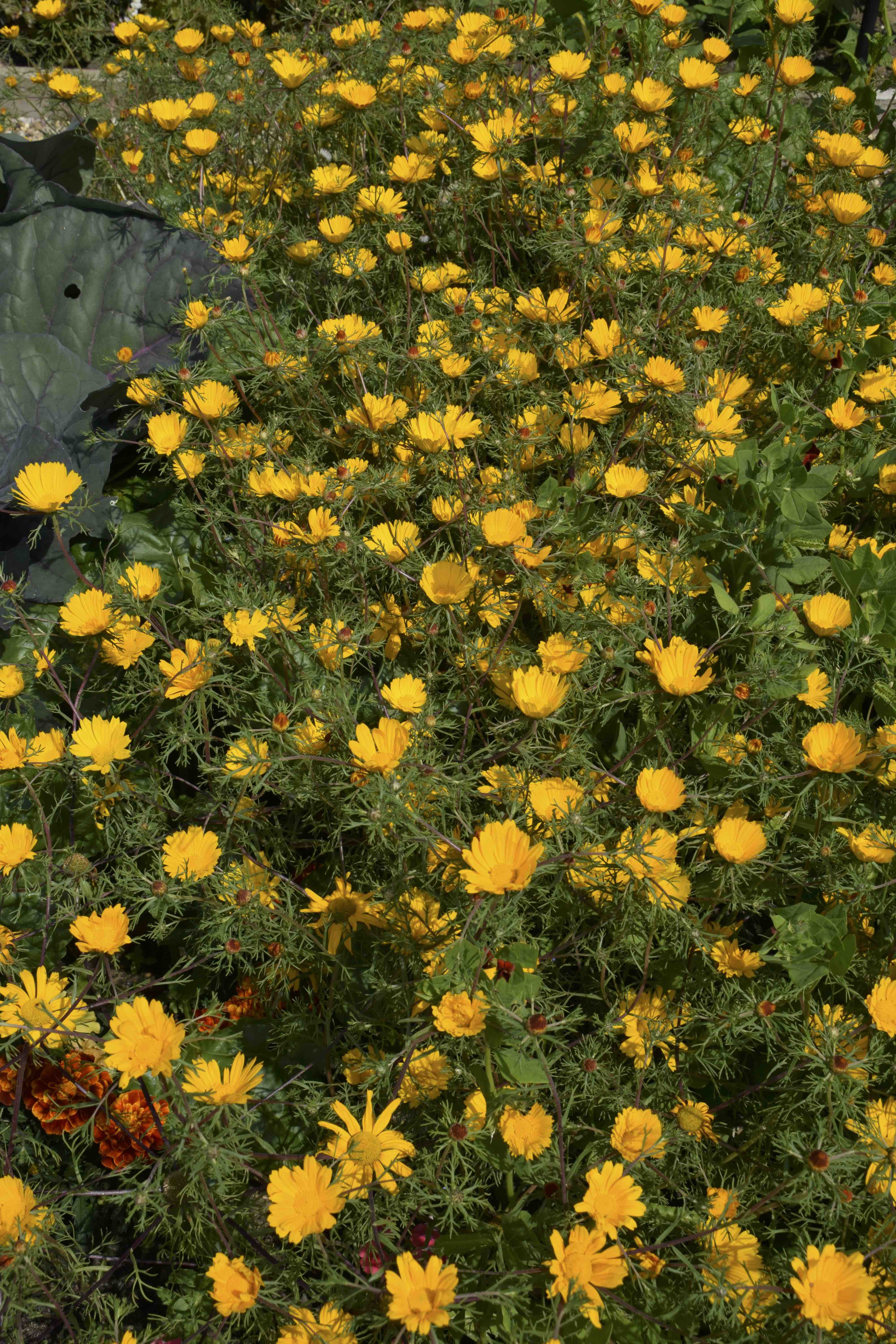 And among these is cladanthus, yet another Mediterranean plant. This is not widely grown but a really nice plant. I like it because of the spreading habit and long-blooming plants though there is just one colour, a rather brassy gold. The flowers are typical daisies but the habit of the plant is rather special. Each stem terminates with a flower ( this is in the Asteraceae so, of course, it is a head of tiny flowers). When the flower opens three to five new stems grow from immediately below it. This is rather like the old hens and chickens daisy and calendula but in those there is a ring of flowers while in cladanthus there are shoots, that end in more flowers, surrounded in shoots and so the plant builds up into a mass of interlocking stems. It is for this reason that the plant is sometimes called criss-cross plant and even the cultivar ‘Criss cross’ which I don’t think is any different from the species C. arabicus.