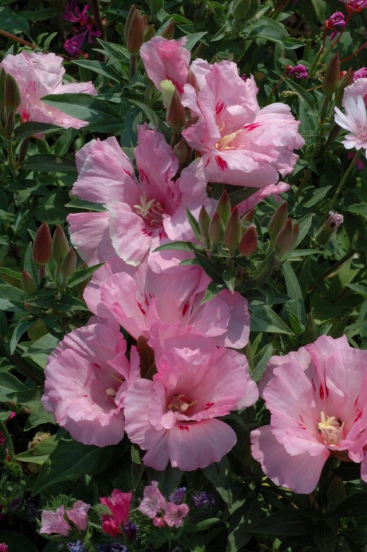 Clarkia pulchella and C. elegans are what we commonly call clarkia with a tall, willowy habit and, usually, double, frilly flowers up the stems in a wide range of colours including pinks, salmon, purple and white. They can be sown where they are to bloom and both are good for cutting. Each flower has four petals but the commonly sold seeds will produce frilly, double blooms. opening up the stems from the base.