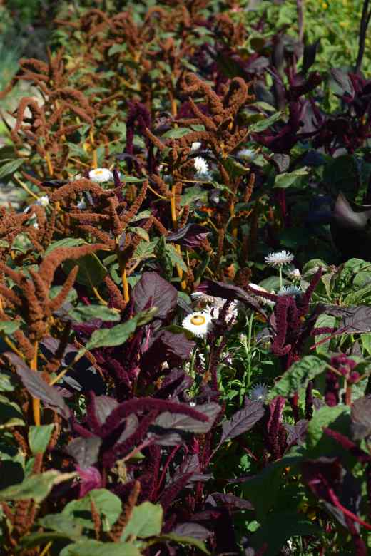 The amaranthus we value for ornament are plants from Central America and Quinoa is closely related. Amaranths have long been long valued for food and every part is edible. The leaves are eaten as greens and the seeds, rich in protein, are a staple in many areas. There are amaranths found in most continents and cuisines. As seen above the best known garden amaranthus is A. caudatus, with its long tassels, typically in deep red but also in green. Similar, but more bobbly, is ‘Dreadlocks’ (above). Most garden amaranthus have upright stems of flowers. While the flowers are tiny, they are surrounded by masses of (soft) bristles that remain attractive for many months. These are usually green, beetroot purple or shades of brown.