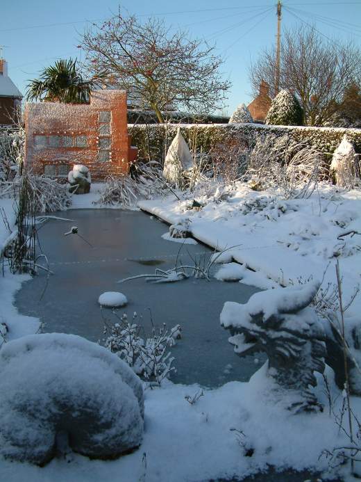 The odd building at the end of the pond was built with twenty or so thin irrigation tubes built in above the glass blocks and with a red light behind it, was quite showy while it worked. Of course the red glow road may have confused people from the road. This was the before LEDs – it would be easier to do now. Unfortunately the whole thing looked a bit like a public convenience but the trachycarpus, peeping out of the top, settled in very well and soon swamped it so the effect was soon softer.