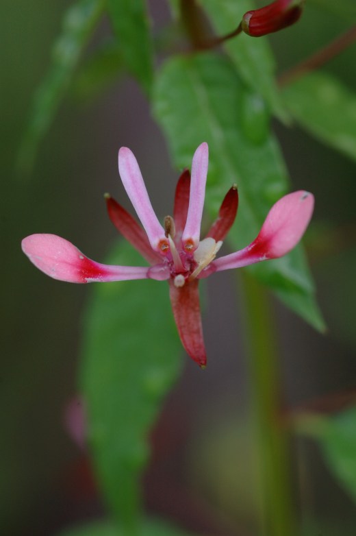 The family resemblance is clear. There is an inferior ovary – set behind the flower – and four sepals and four petals. But while the flowers of fuchsias and evening primrose are actinomorphic – can be cut in half in many planes to give identical halves, in Lopezia they are zygomorphic – can only be cut in half in one plane – and have a definite upper and lower portion to the blooms. The common name of mosquito flower is immediately obvious when you see a bloom. I think it must be lockdown stress but I find the flowers really cute.