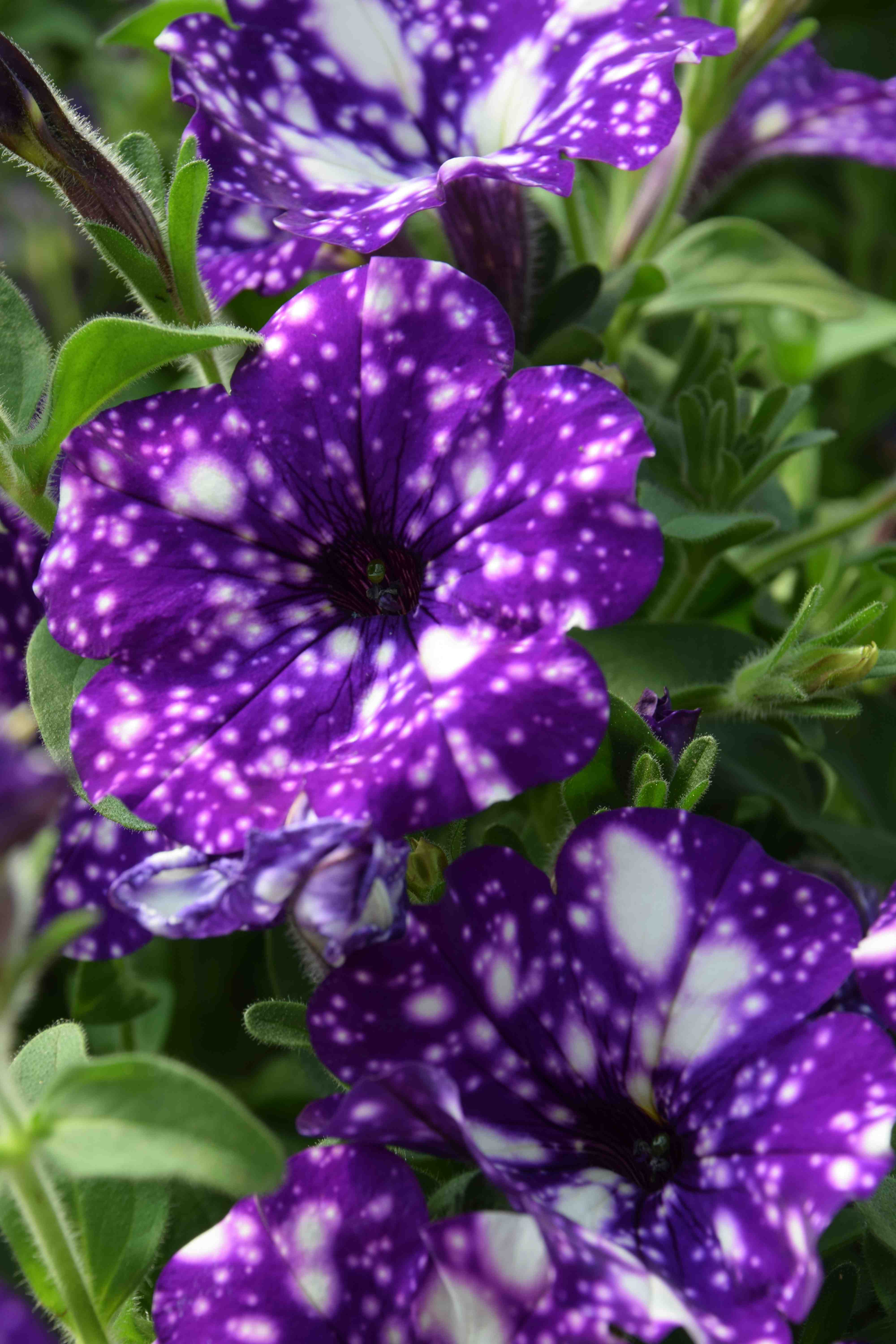 Who knows where petunias will go next. We already have yellow flowers, green edges and blacks – as black as any flower I have seen. A few years ago ‘Night Sky’ (above) was introduced with dark blue flowers irregularly spotted with white. I was immediately captivated, but just as quickly turned my back – it looked too much as though badly attacked by mildew. A pink version followed. Novel as these all are, I find that they are difficult to use in the garden.