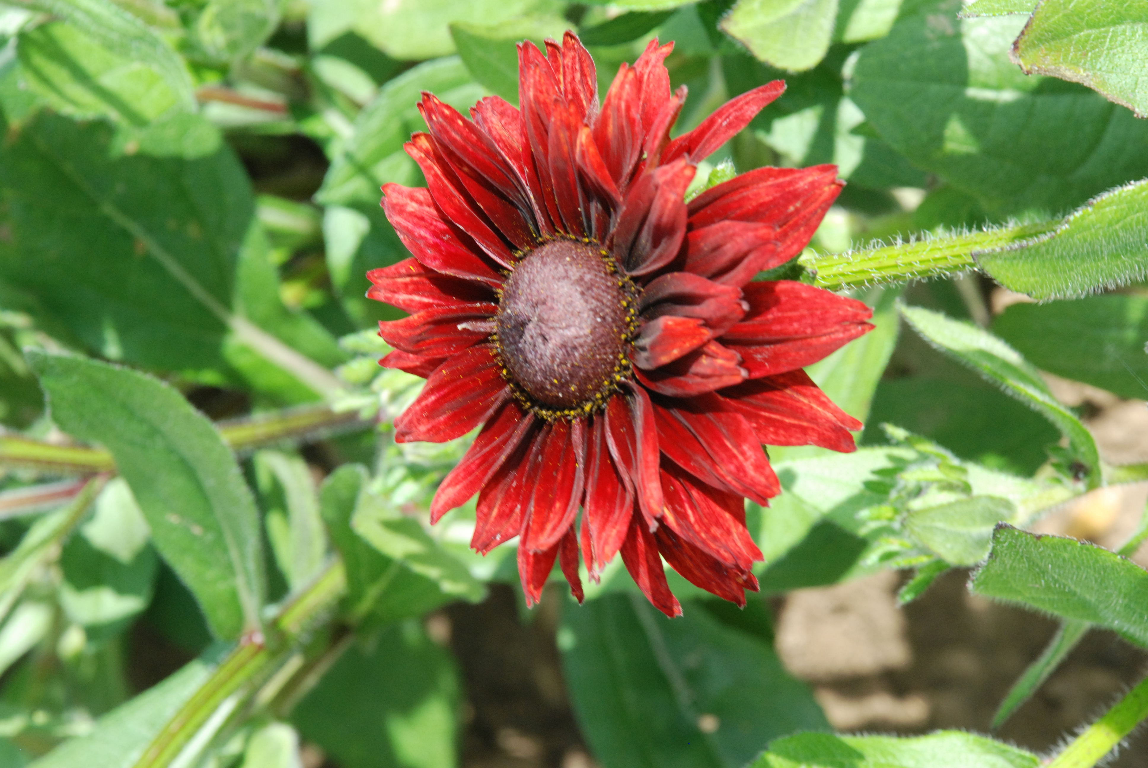 But back to R. hirta. This is native to eastern North America but has since naturalised in other areas and is the State flower of Maryland. It is a coarsely hairy plant with large basal leaves and is best grown as a half-hardy annual. It is theoretically biennial or a short-lived perennial. The joy of this plant, apart from the cheerful flowers, is that it is a robust plant suitable for bedding and adding to mixed borders. It is also a wonderful cut flower, lasting at least a week in a vase. The flowers are typically ‘single’ but there are doubles, in varying degrees and the colour range has increased to include browns and oranges and wine-red in ‘Cherry Brandy’ (below). Heights have also been ‘improved’, which means shortened, including the hideous ‘Toto’ which should be trodden on to put it out of its misery.