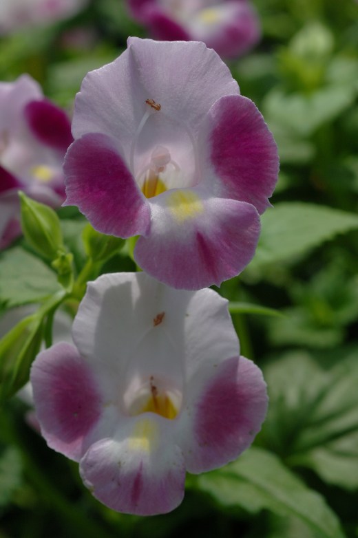 Torenias, commonly called wishbone flowers because of the shape of the two stamens in the front of the flower, which are united at the top, are Asian annuals and in the Linderniaceae, having recently been split from the Scrophulariaceae (now Plantaginaceae).