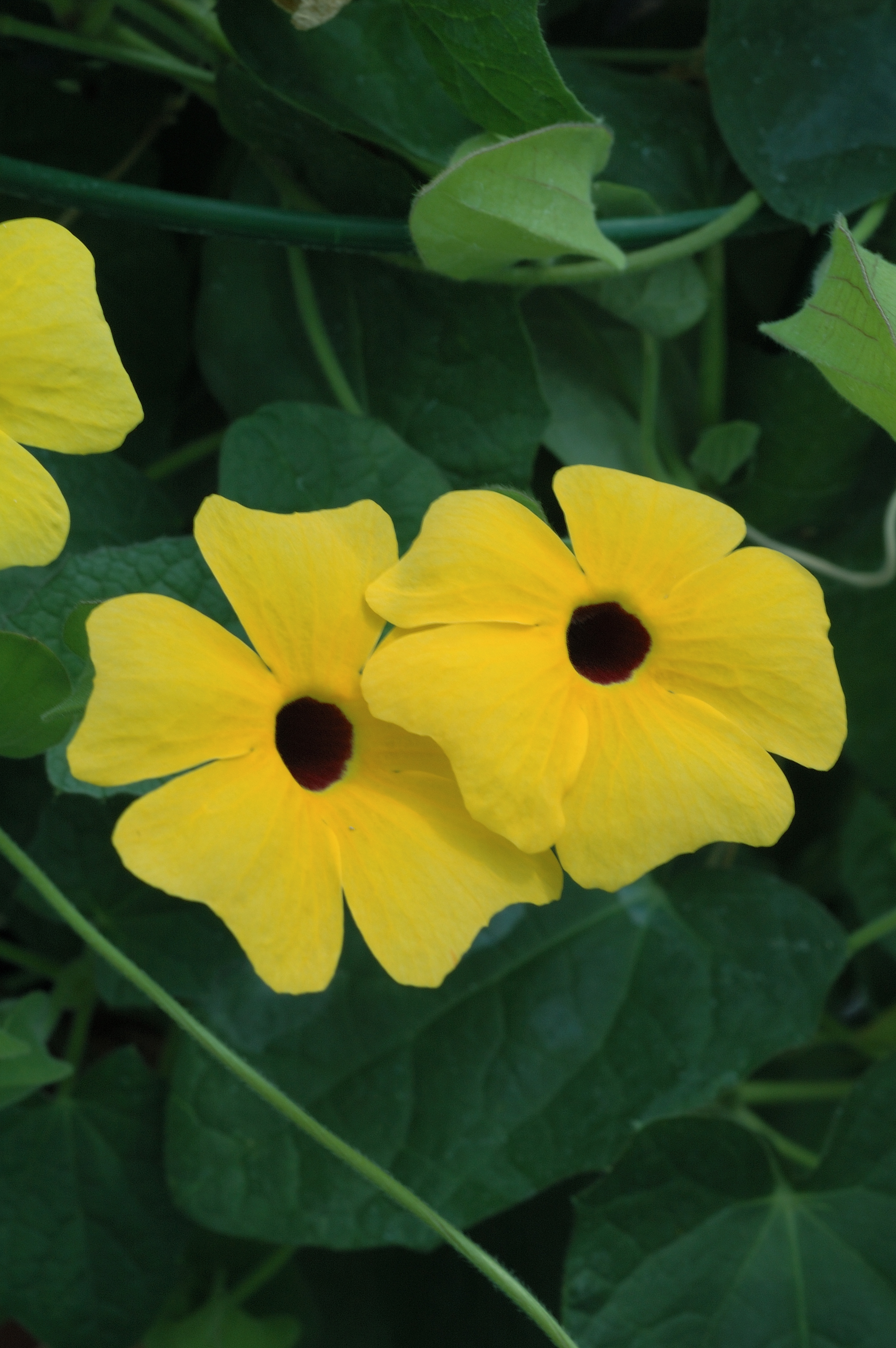 Thunbergia alata is a twining climber with large, typically orange flowers with black centres, leading to the common name of black-eyed Susan. The large, round seeds can easily be sown, two or three to a pot, in March at 20c and readily germinate and, with plenty of light, grow quite quickly, ready to be planted out after the last frost. Although plants can reach 1.5m in a season they are best grown in really good soil in a sheltered place or in patio containers. They will flower all summer and into autumn. Without support they scramble sideways and they are often recommended for hanging baskets though they tend to climb up the chains rather than form a cascade of blossom. In theory these are perennials but they are almost always grown as annuals here.