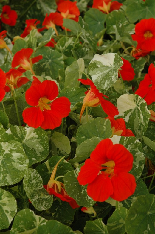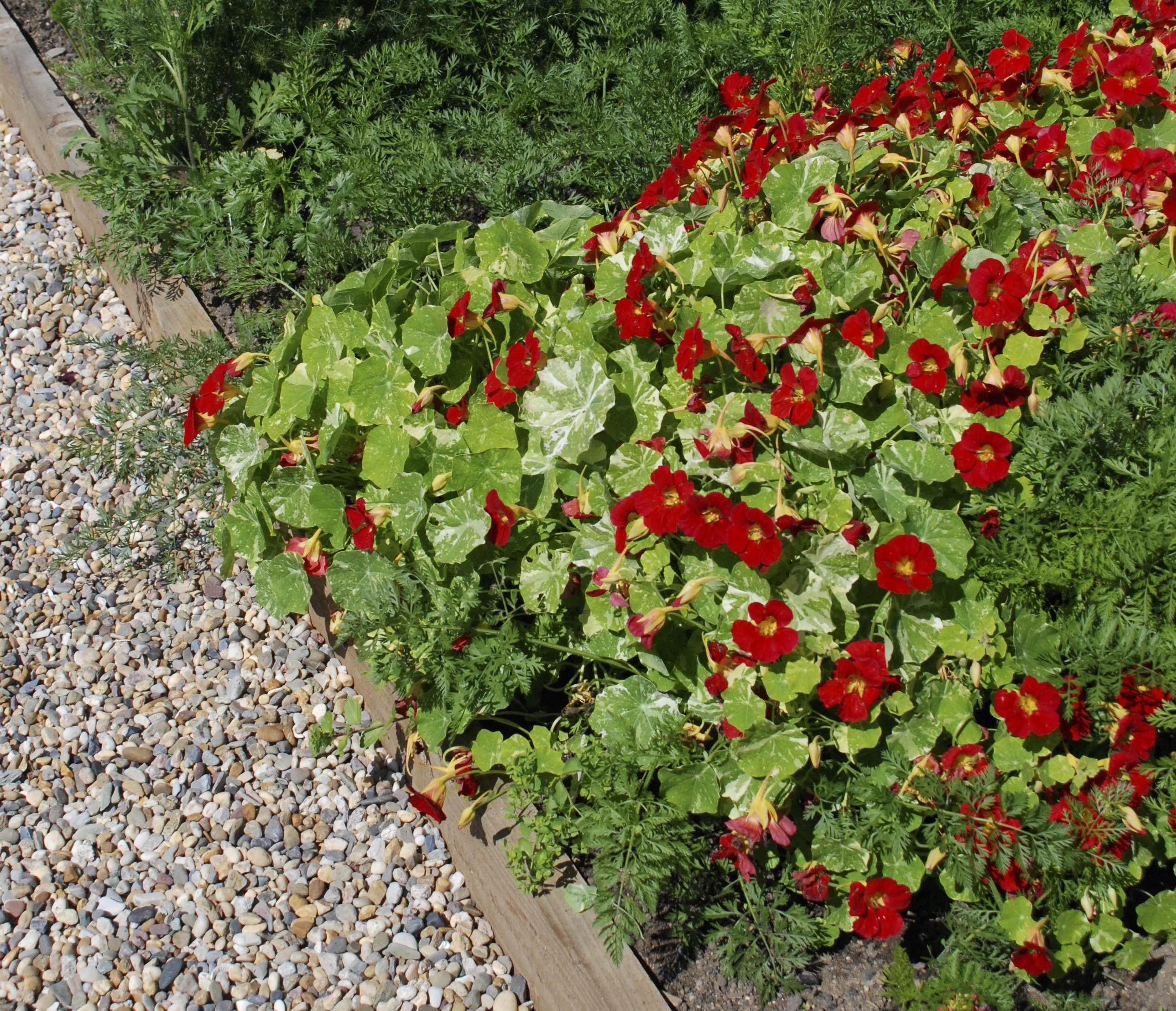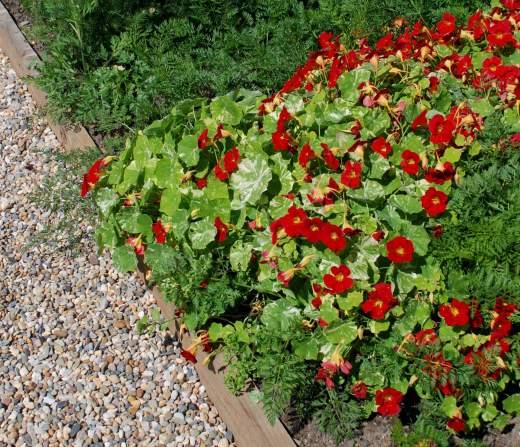 Nasturtiums can be used in any sunny place in the garden and are good to fill large areas cheaply. They are often recommended for hanging baskets but I am not that keen on the idea; they are a bit ‘cheap’ for a hanging basket – a bit like being invited in for a sherry and being given a glass of British sherry or Emva Cream (this may not make much sense to those not in the UK but neither are very good – I wouldn’t even put them in a trifle).