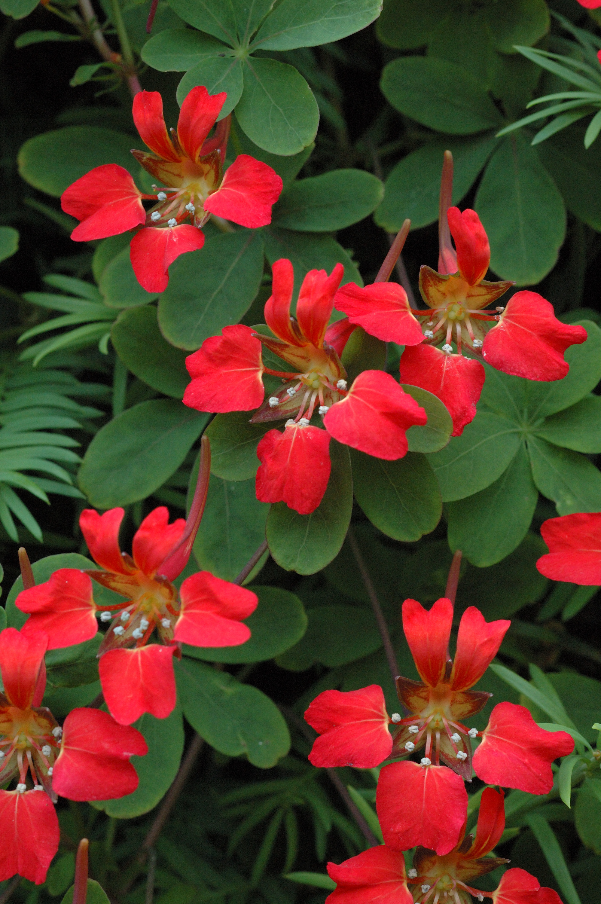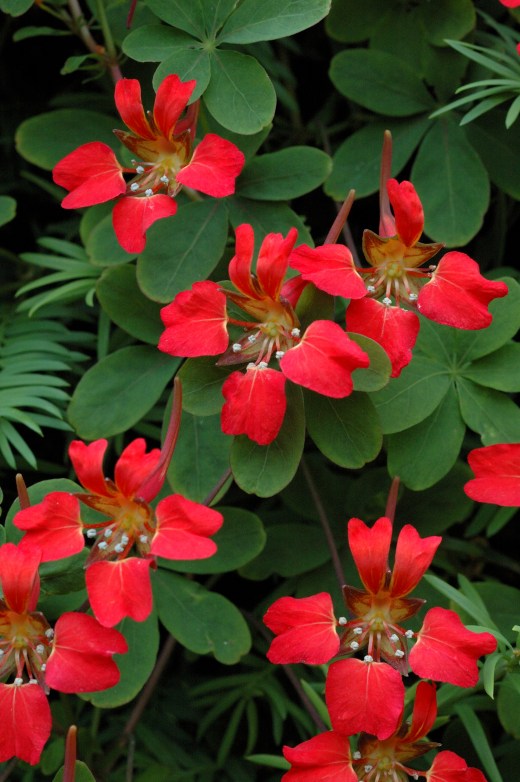 And finally, one of the many real celebrities in the genus. While the common nasturtium is such an easy plant to please, many species, though not impossible to grow, need specific treatment. Many are best in a cold greenhouse to protect them from wet when dormant while others can be grown outside in scree and rock gardens. The most famous of them all is the Scottish flame flower (T. speciosum), from Chile. It needs moist, acid, leafy soil and dislikes hot, dry conditions in summer – hence it does well in Scotland. It is at its best when grown up yew (taxus) hedges, a remarkable feat of horticulture as the hedges need to be trimmed in August, just when the tropaeolum is flowering. Where happy, it is as vigorous as bindweed, clothing hedges with growth up to 3m. In drier soils it is more sedate but will still bloom on plants a third as high. It is notoriously difficult to establish and should be left alone once it is growing strongly. It is best to cadge fresh seeds, sow in pots and plant out as young plants rather than bare roots.