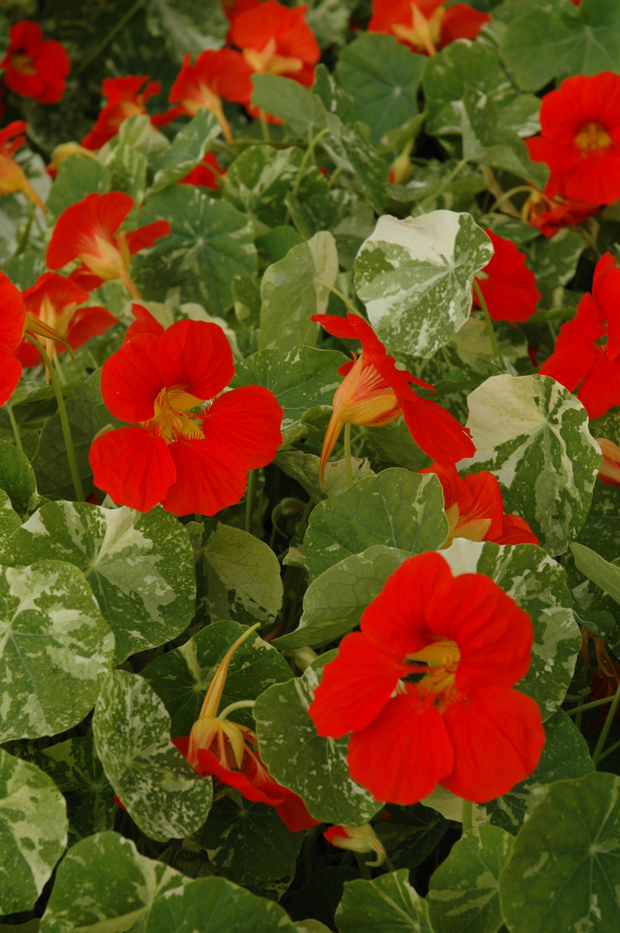 So, if you want to grow nasturtiums, and I grow them every year, sow the seeds in pots in April or direct in the garden in late March. There is no use starting them too early because they grow quickly and will not survive a frost. These will not survive overwinter from a September sowing either. There are climbing and compact, bush types. Flower colours vary from cream through yellow and orange to crimson and almost purple. Many have contrasting spots and splodges. Those with variegated leaves, which come true from seed, are especially decorative. A few years ago the ‘Phoenix’ types with deeply cut petals was popular but it was not too stable and does not seem that common now.