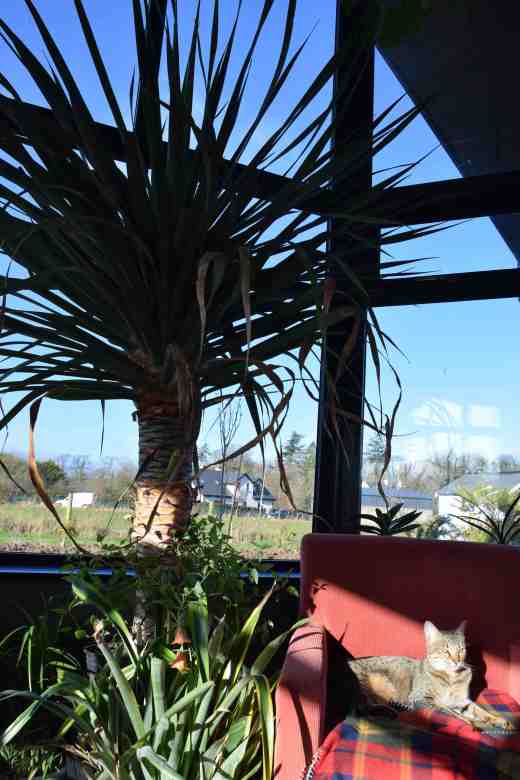 My seedlings are from purchased seed collected in Gran Canaria and others from Tenerife and this is the latter. I am ridiculously fond of the plant, as I am the dragon tree it is scrambling up. Look closely and you can see Mia catching some rays.