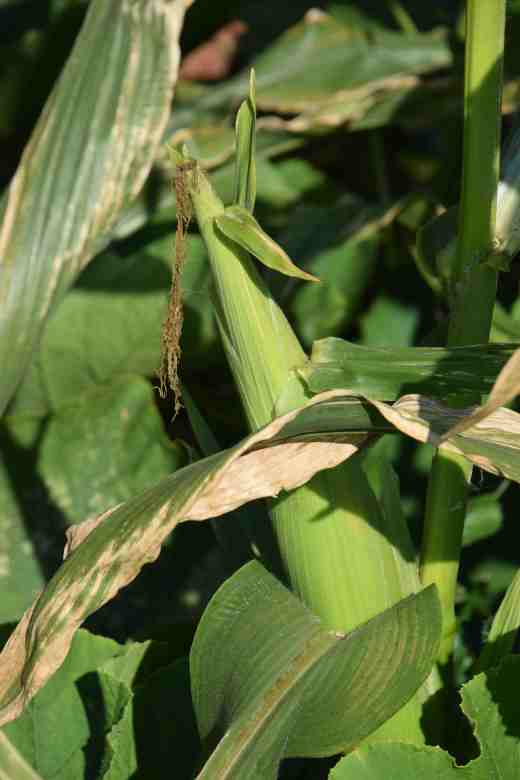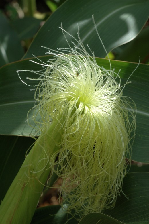 Because sweetcorn is a grass, it is wind pollinated and pollination is necessary or you won’t get a crop. The pollen, on the male flowers or tassels are held at the top of the plant (above). The potential cobs (below) are produced lower on the plant and, depending on how well the plants have grown, you will get one or two female cobs on the main stem and there will be several, smaller shoots from the base. The pollen has to drop from the top of the plant onto the lower, female cobs, helped by the wind.