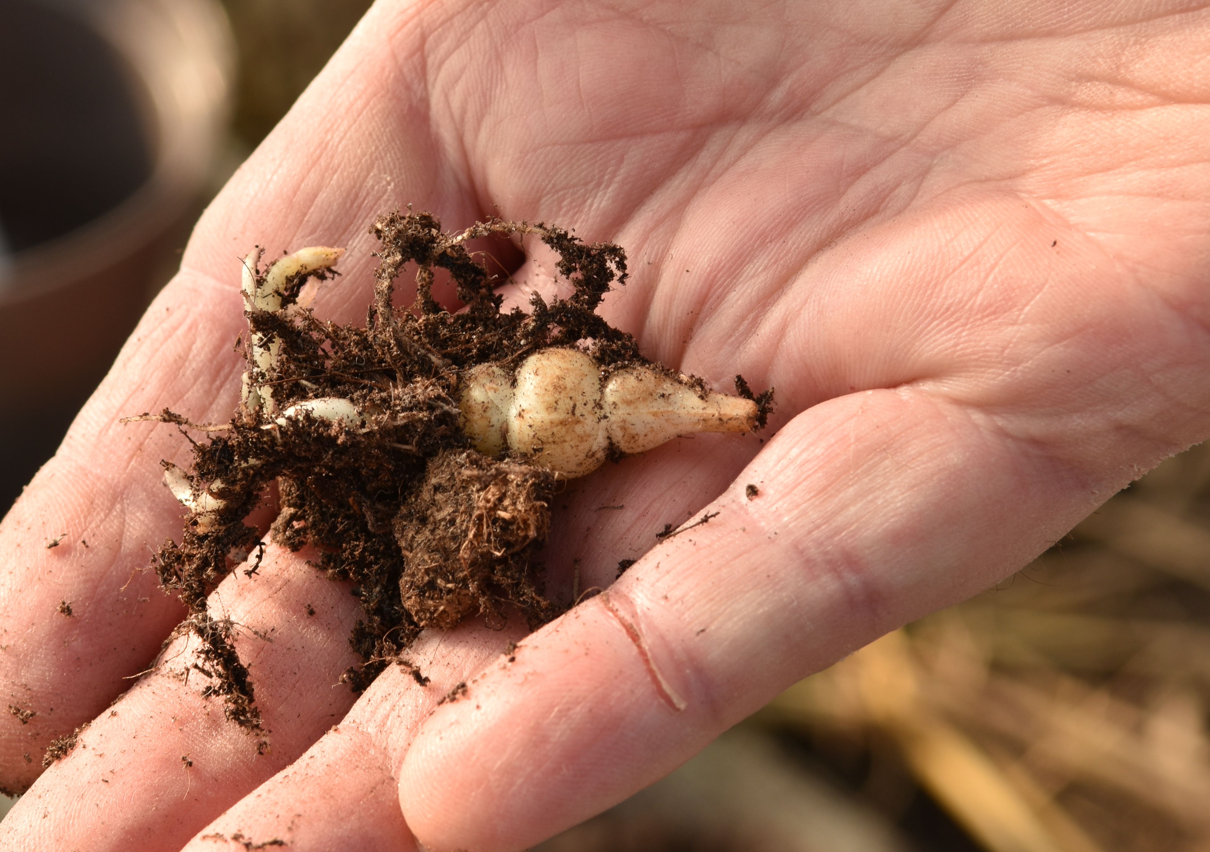 It is not grown from seed but from the strange rhizomes. These as produced as the plant grows and harvested in autumn when the plant dies down. They are rather grub-like with thin white skin. As they swell the rhizomes are constricted at the nodes and the internodes swell. They can be six or seven cm long but are frequently smaller.