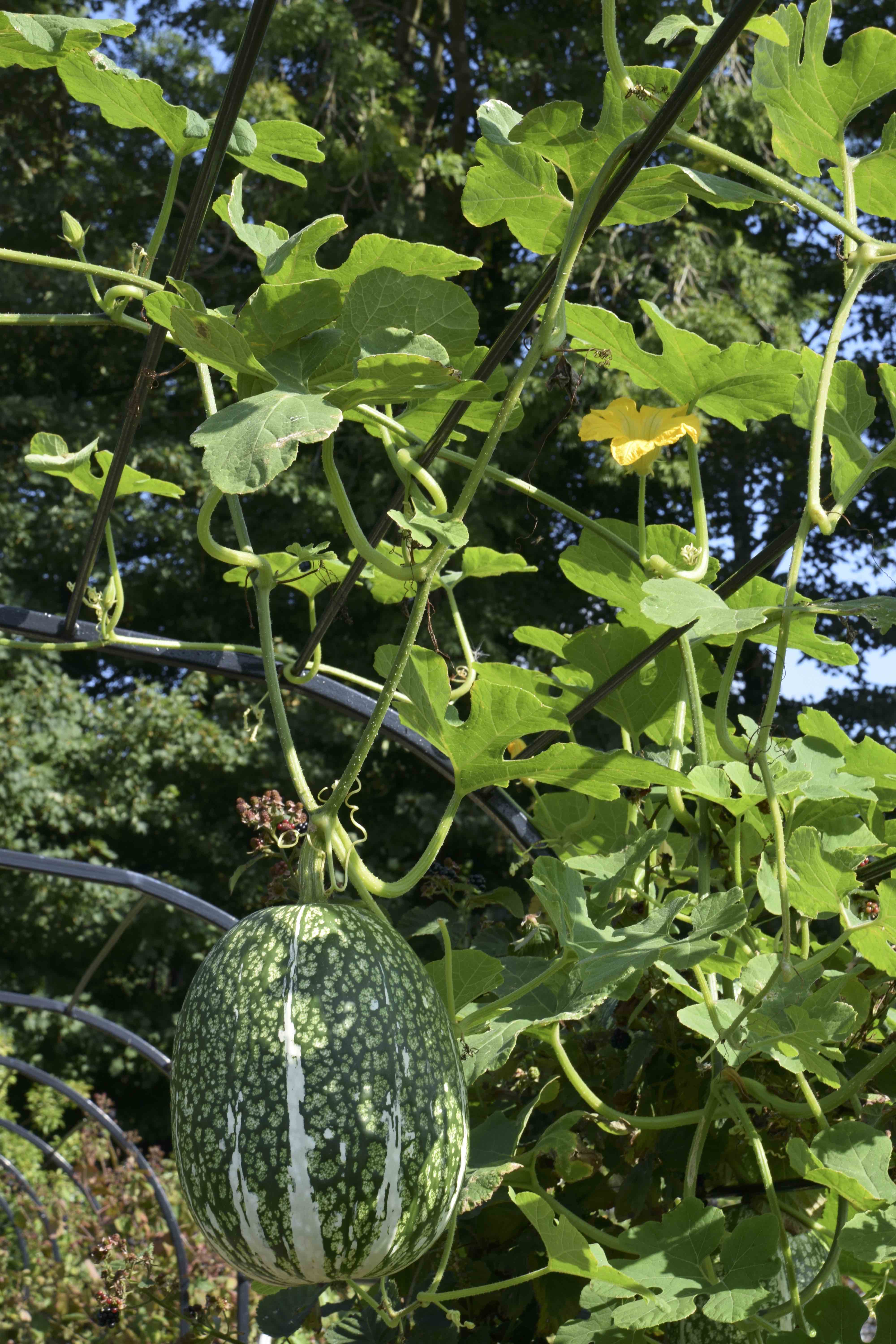 Botanically Cucurbita ficifolia, the fig-leaved melon, it is an annual that is capable of extraordinary growth. It is frost-tender so the large black seeds need to be sown, in their edge, in individual small pots, in gentle heat (20c) in spring and the young plants put out after the last frost in spring. Although young plants are killed by frost, in autumn the old plants can withstand a light frost or two. What I love about the plant is that it is rampant! Even in the cool climate here it will easily reach 4m high (or wide) and in warmer, sheltered places it can easily exceed that. If allowed to sprawl along the ground it will root as it goes. The lobed leaves look quite exotic and the yellow flowers (both male and female on the same plant) are big and beautiful. Soon after pollination the fruits start to swell and they are really beautiful, striped and spotted like a watermelon. If it is grown as a climber the fruits hang from the stems, which are incredibly strong, and the fruits hang from the support, making it fun and hazardous to walk beneath. The fruits are about 40cm long and weigh about 5 kilos. Each plant can carry lots of fruits and even here a dozen fruit is not unknown. As they ripen the ‘shell’ also becomes incredibly tough and ripe fruits can be stored, if necessary, for several years. In times past the fruits were taken on sea voyages for food because they store so well.