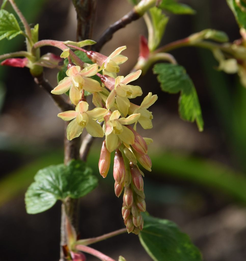 I think that every plant in this garden has given me sleepless nights and after the wicked frost we had last May I regard every high pressure system with fear. We are having some warm days right now but an arctic blast is forecast for the Easter Weekend and I am sick with worry about my ribes and lots more. The flowers are absolutely beautiful and I love the colours. I need to look closer because the flowers, and presumably the plants, are either male or female with the males having longer racemes. I suspect mine is a male but I won’t make assumptions and need to have a close look. The racemes of blooms are elegantly shaped and I think I have a new favourite ribes. Fingers crossed late frosts don’t kill the flowers.