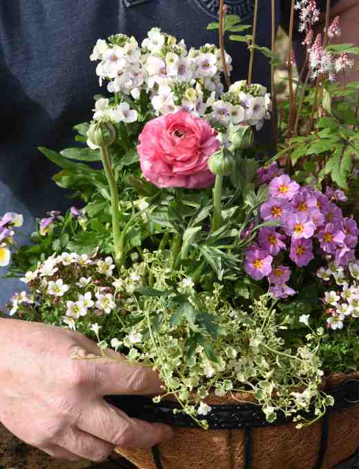 But the other thought I was having came to me when I was doing my weekly jobs photo shoot for Garden News and planting a seasonal hanging basket. It is difficult to get out to to buy anything for these shoots so I had a limited choice but managed to dig a few out of the garden and pick up a few plants including a rather strange Erysimum. It was not till I had planted it that I realised that the flowers were white. Admittedly they have a lilac eye but they are white. And I have never seen a white wallflower.
