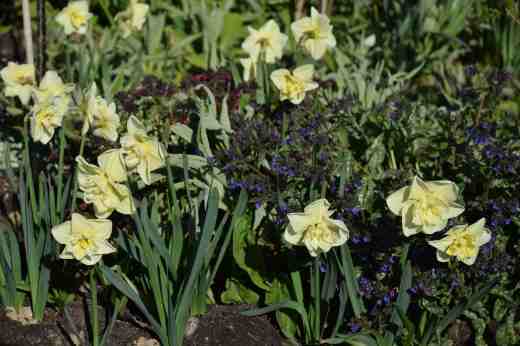 I will end with a daffodil. This is ‘Dancing Moonlight’, one of the new ones planted last autumn. It is a butterfly daffodil with a split corona, though it is a bit hard to classify because it has a few extra bits of petals in the centre. It is a robust, stocky plant and I love the colour which, as the supplier suggests, is hard to describe. It is a lovely, luminous, greenish primrose yellow and, though it is impossible to pick favourites, It is very good. The wet winter has been a trial for many daffs but every one of these grew and the 20 bulbs have made a great show. I look forward to seeing this increase over the years. It is too early to rate but I am smitten at the moment.