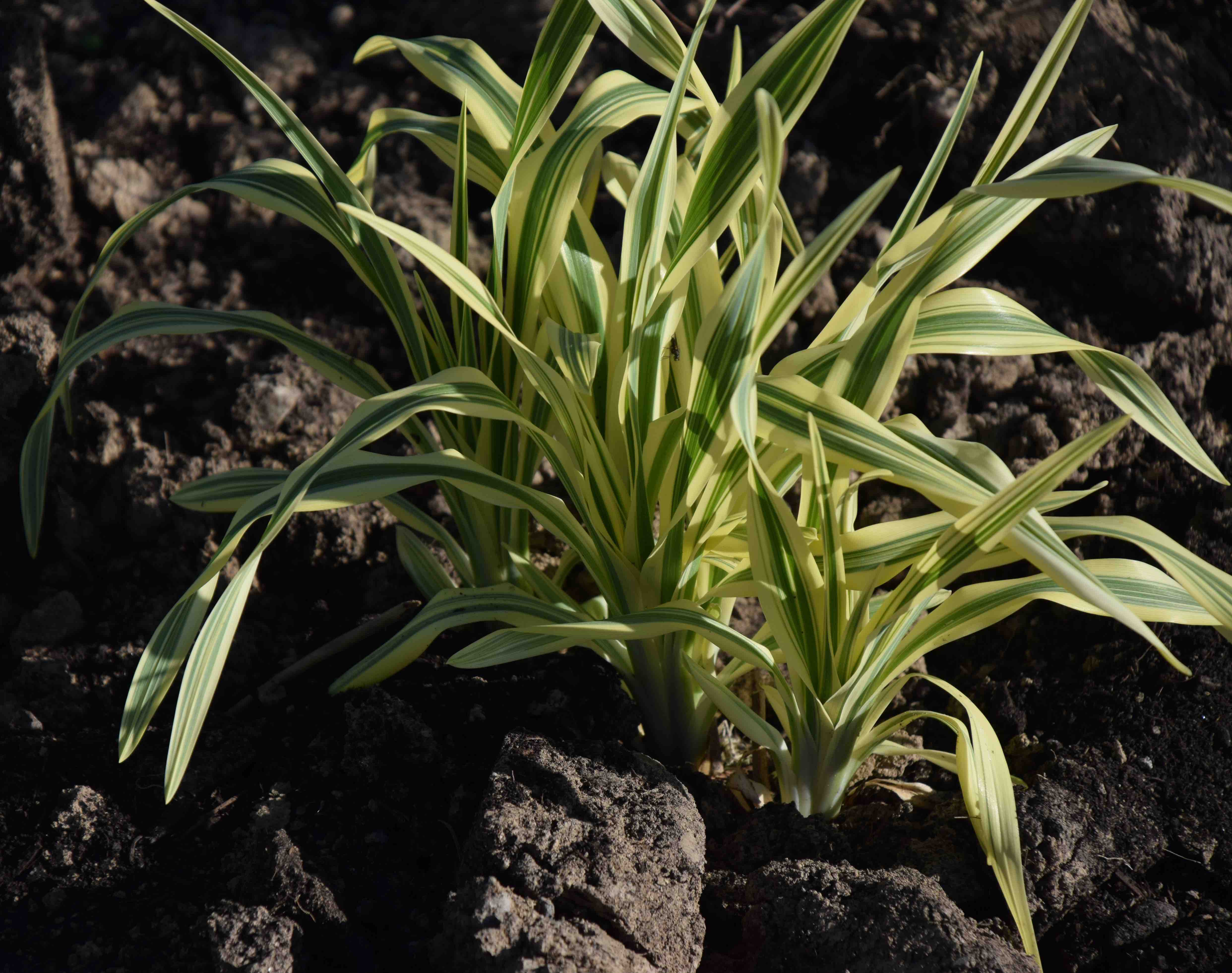This is hemerocallis ‘Golden Zebra’ which is also planted here because of the brightly variegated leaves. It is a smaller-growing day lily and unlike the other variegated hemerocallis I grow, is neat and forms tight clumps and does not revert badly. I may regret planting it here only because the flowers are orange and a bit brassy for my desired colour scheme here but then rules are meant to be broken and the leaves will be present far longer than the flowers.