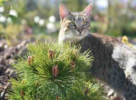Mia always takes an interest in what we are doing and is happy to inspect new plantings like this dwarf pine by the pond.