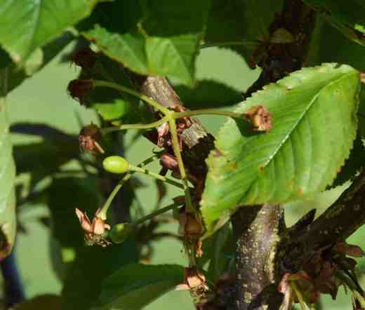 I know from experience that only a fool imagines a bed full of flowers when they see the first sign of seedlings germinating. To continue my use of proverbs, ‘there’s many a slip ‘twixt cup and lip’ as well as the foolishness of counting chickens before they’re hatched. So it is sheer madness to expect anything from my cherries this year. I have two planted, a white and a red. The white is the old, ‘Bigarreau Napoleon’ and the dark red ‘Penny’. The idea is that ‘Penny’ will pollinate ‘Napeoleon’ but in this, the first year they have bloomed, that was not to be because ‘Penny’ did not open a bloom (there were only five) until after all ‘Napoleon’s (many) flowers were over. I need to check the name of ‘Penny’ because I was sure I had been careful and made sure she was self-fertile and would be a good pollinator but now it seems I may have ‘boobed’. I may need to plant another to overlap flowering time. There are some wild cherries nearby that I thought would be a safety net but they flowered later too. So I spent a few minutes every day picking a flower off an ornamental cherry and attempted to pollinate the Nap. I had no idea if this would work but I see that I do have two cherries set. But I need to ignore them now and not check them every day or I am sure there will be tears!