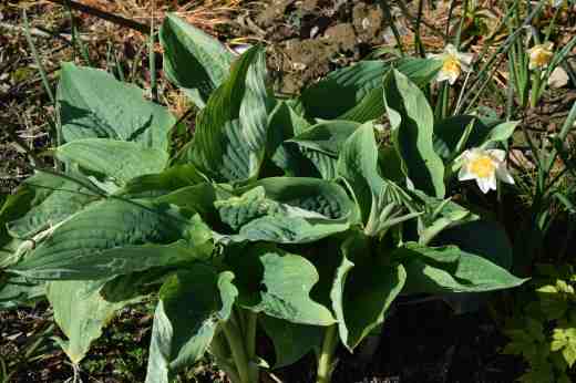 ‘Empress Wu’ that giant hosta has illustrated this well in the garden this spring. I have three clumps, two of which are in a bed either side of a young styrax (which is not exactly ecstatic after the cold spring). Although this bed has a curved hedge around it on the south side (still very young) it is largely sunny and gets morning sun. The persistent April frosts have done what the mid May frost did last year and has turned the first leaves to cling film. They will be OK but they look unhappy.