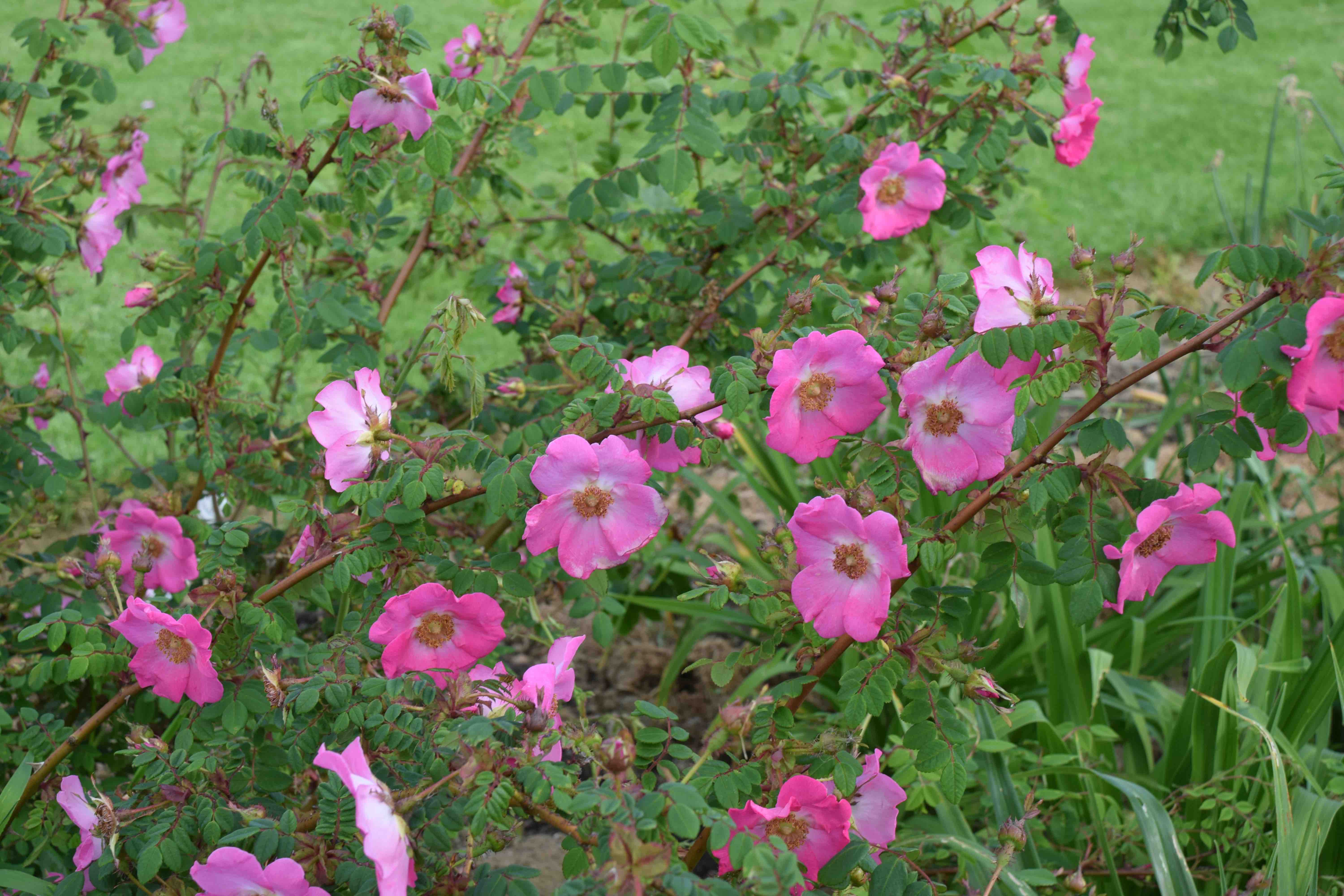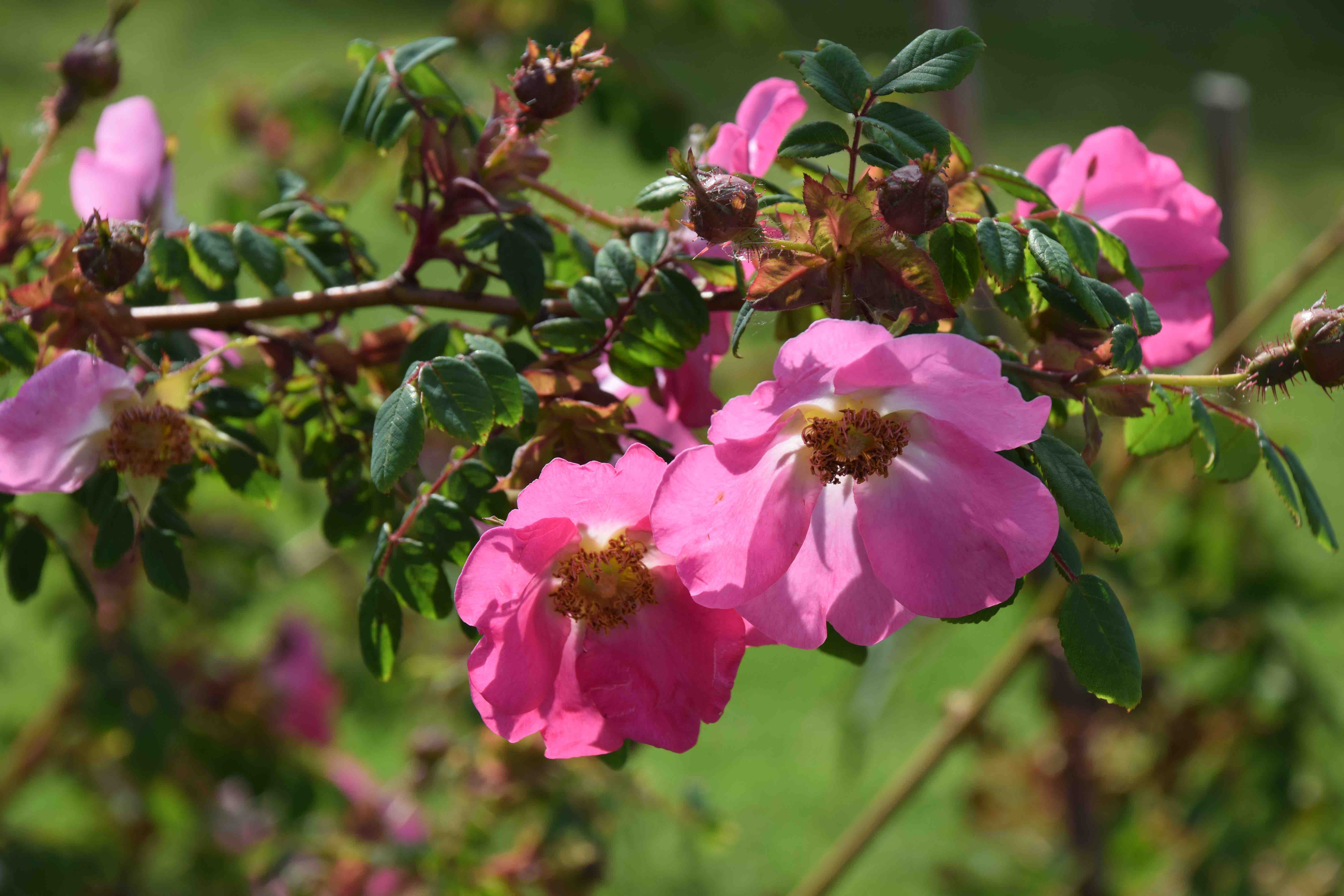 If you consider this as a rose it is a slightly odd thing – and a bit of a let down. The flowers, though beautifully coloured and quite large, are rather hidden in the foliage and they don’t last long, though they so open sporadically here and there. But as a shrub I find it really satisfactory. The habit is really well branched and rather stiff in a tough, muscular kind of way. As it matures it has peeling bark too and plants can reach 3m high. The leaves are divided into small leaflets and the hips, which remain largely green, are covered in lots of small spines, leading to the name of chestnut rose.