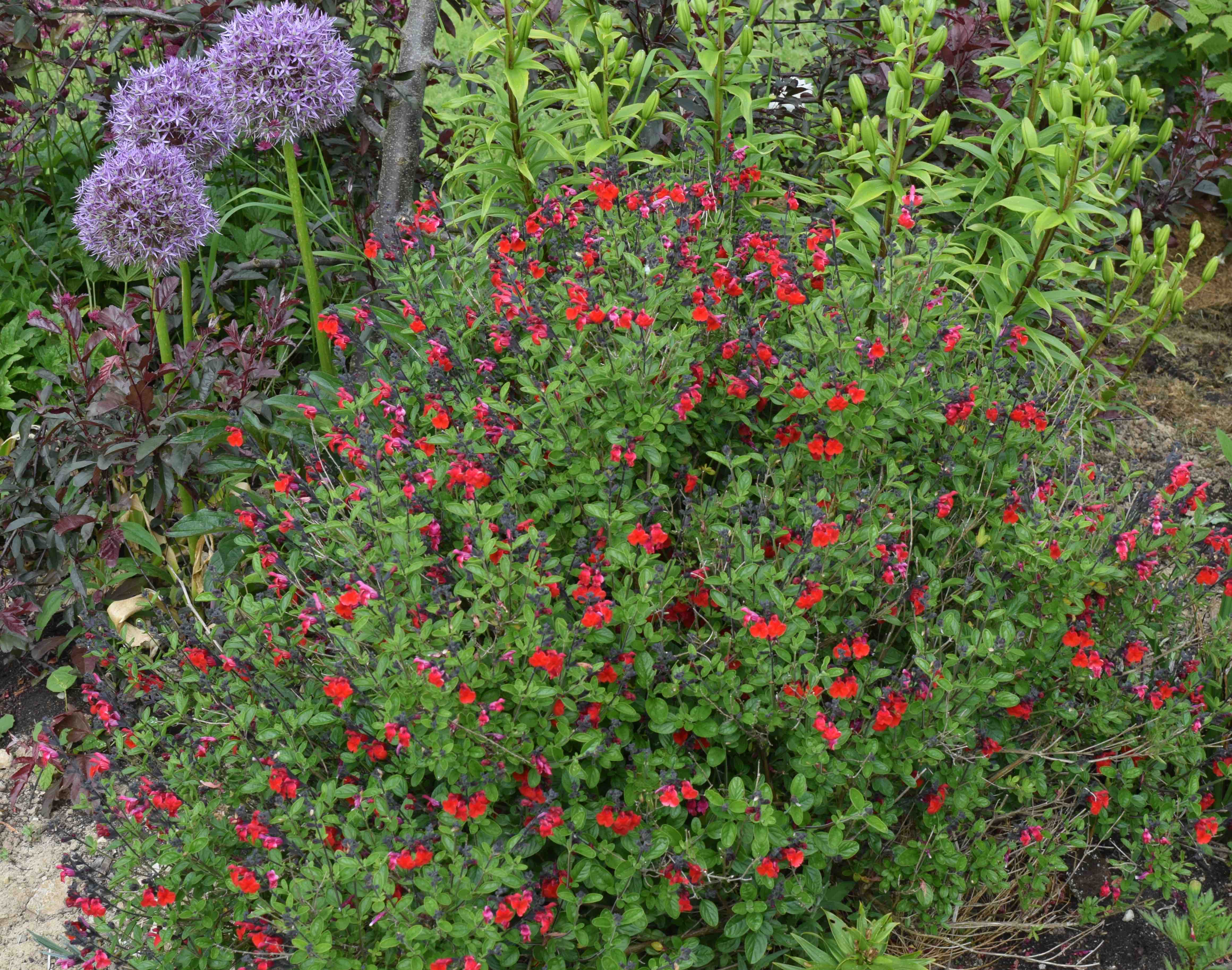 ‘Royal Bumble’ is a great one; grows very well in the garden. We saw an unnamed salvia in Lismore Castle Gardens at the weekend, small-flowered, strong purple/blue with a very strong smell from the foliage when touched. Very attractive.