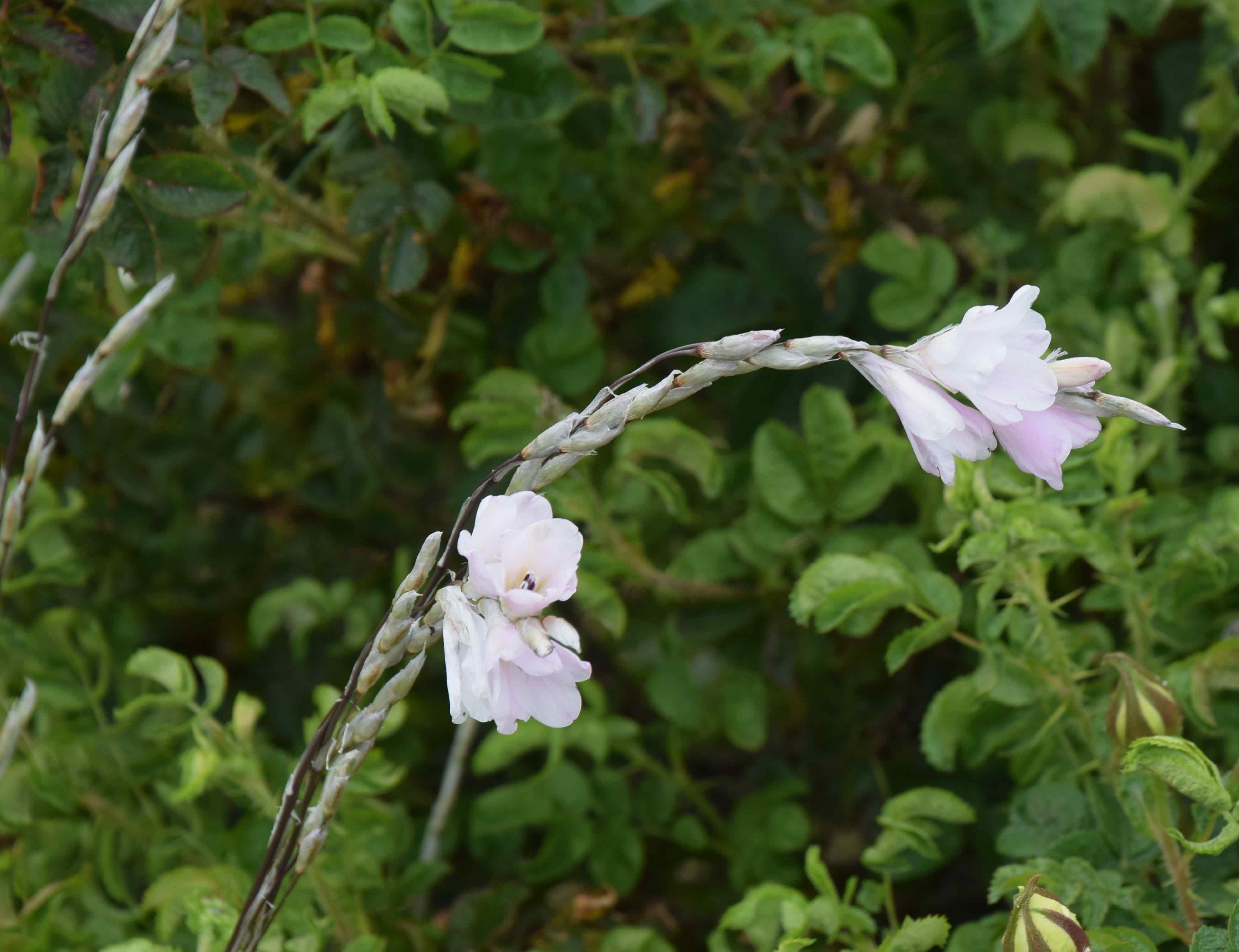 I have planted a few dieramas in the garden – they are such a characteristic component of Irish gardens. I have always been rather frightened of them in the past with their reputation for being rather tender and dislike of wet soil. But I took the plunge and have been delighted at how well they have done. This is ‘Guinevere’ growing in the yellow and white garden. The flowers have a slight pink tinge when young but I suspect this may be exaggerated by the hot, dry weather. In any case, although it does not strictly follow the colour scheme I can forgive her a slight blush because dieramas are such beautiful plants.