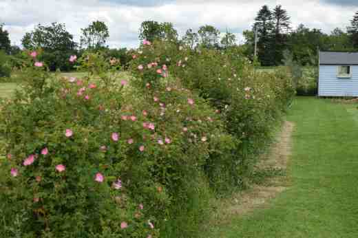 My rose hedge, mixed with other shrubs, is Rosa rubiginosa (R. eglanteria). This is native to Europe, including Britain but I am not sure if it is native to Ireland. It is like the dog rose but smaller and prefers alkaline soil. However, it is perfectly happy here. The joy of the plant is that the leaves are fragrant, smelling of apples, especially in damp weather. I can prune this in various ways. I could cut it all back hard to promote foliage but I will lose flowers. instead I will remove some old stems after flowering – they tend to die anyway – and allow newer stems to take their place. I will not trim with hedge trimmers because this leads to a central build up of dead, unproductive growth. Some long stems will be shortened, just to keep the shape and prevent mowing turning into a blood bath!