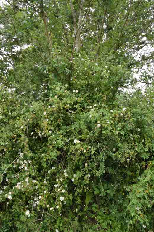 I’m loving your eglantine rose hedge. Yes I think it’s a native here. There used to be one in the hedge nearby but unfortunately the farmer tore it out. My neighbours planted a native hedge of Sycamore, Birch, wild Cherry and Goat Willow! When I realised they weren’t going to top it I asked them to – quite unsuccessfully! It has now completely obliterated my lovely view of the Little Sugarloaf even though they are about 20′ lower! The planners should stipulate what they mean by a hedge! I have a very vigorous self seeded rambler (not from here) with sprays of small double white flowers – at the moment. Any ideas?