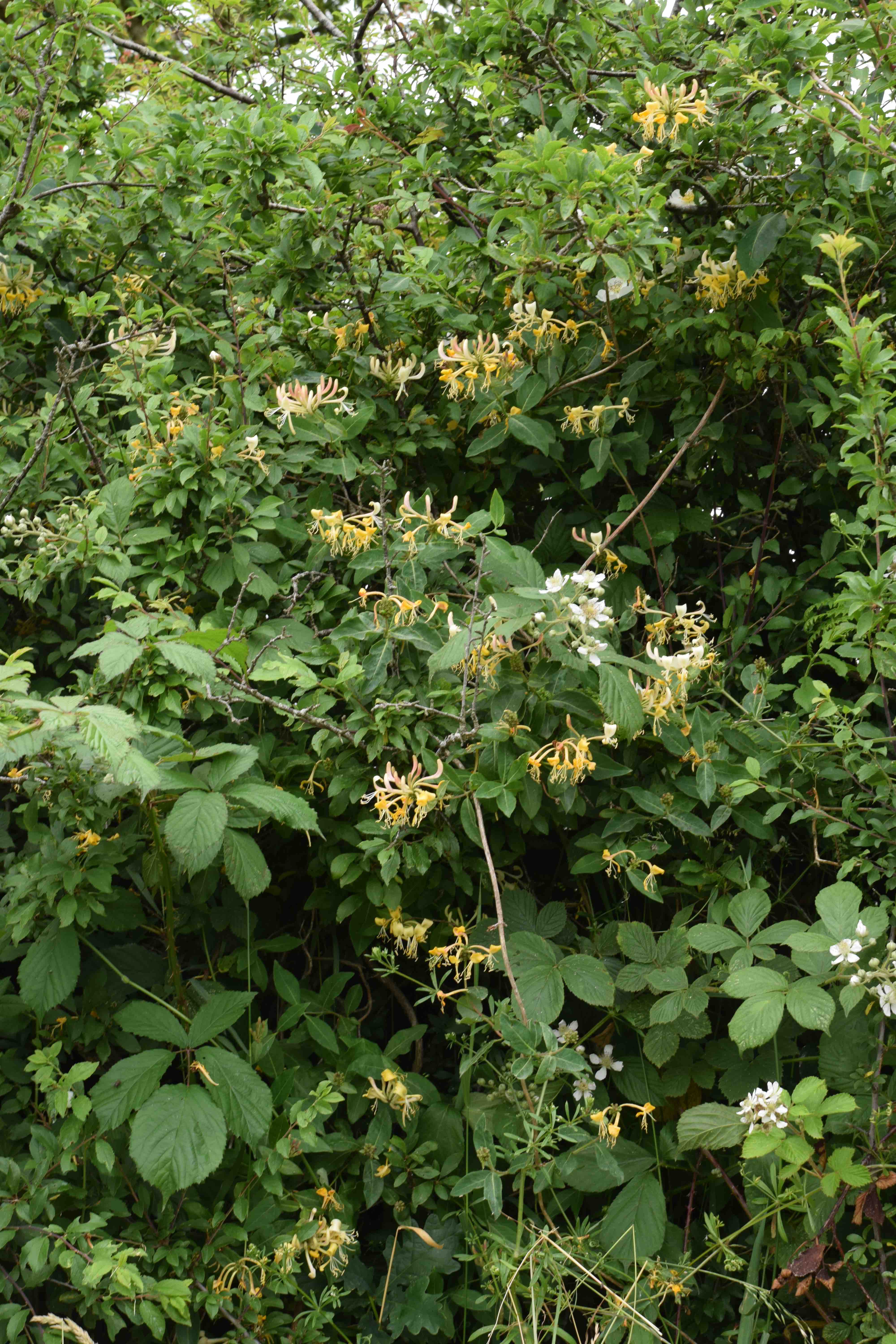 And between and among the roses is wild honeysuckle (Lonicera periclymenum). Everyone loves honeysuckle and I am no exception. The plants twine up the shrubs in the shade and flower profusely, and fragrantly, in the open air. This is a lesson for all those who plant honeysuckles on a small bit of trellis on a baking hot wall – they love shade. Unlike those poor captive plants in burning sun, these wildlings never have mildew and the flower buds are not covered in sap-sucking aphids. One thing I do need to watch are the brambles in the hedge. Apart from being too boisterous the birds will drop the seeds everywhere and I really dislike brambles in borders.