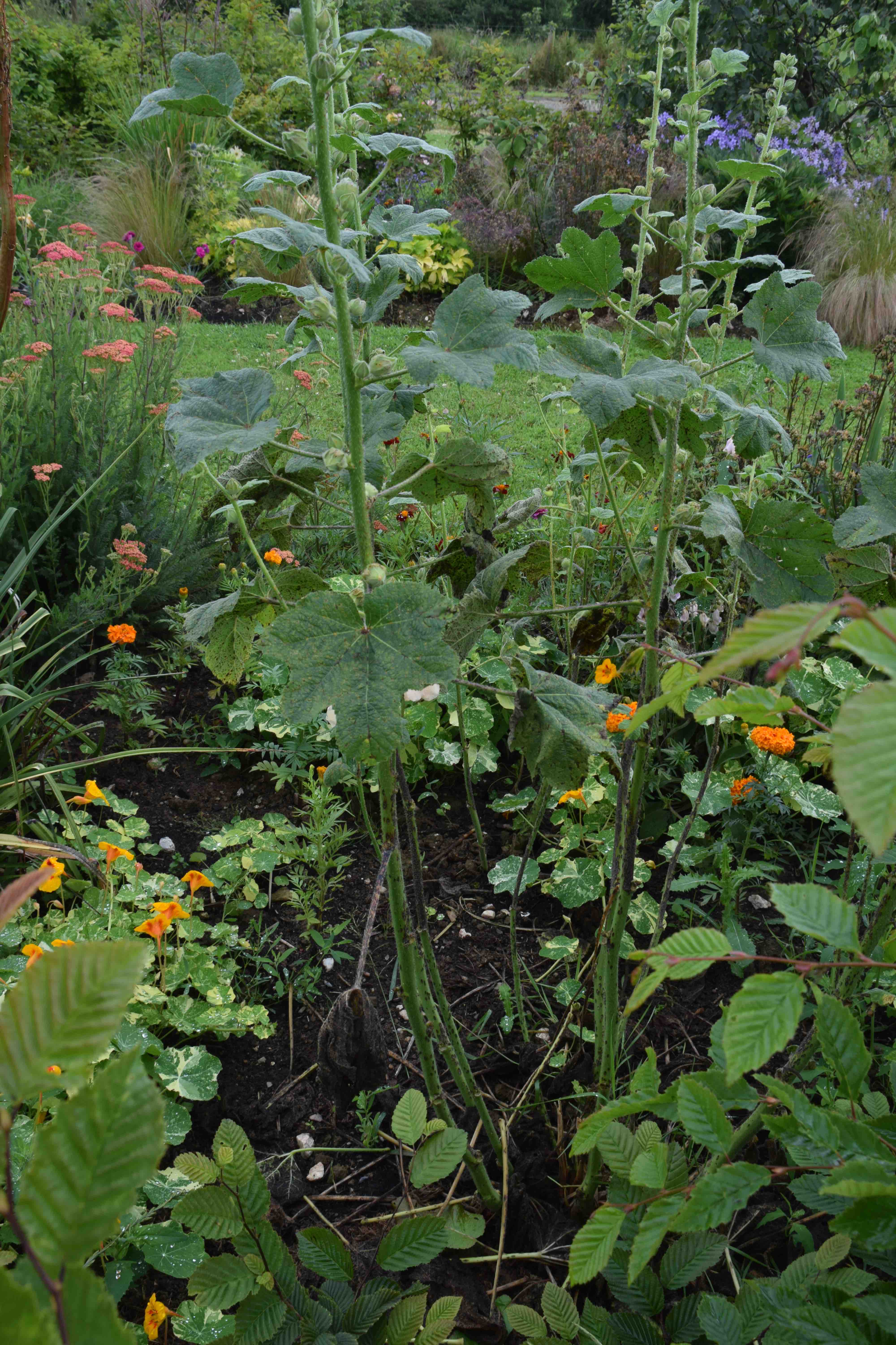 What I don’t like is my hollyhocks. I was disappointed with them last year when they were not the clear yellow I expected but tinged with pink. Those in the yellow and white garden had to go but some in the long borders were reprieved. But as soon as growth began this spring rust moved in. I am completely unfair and illogical in my treatment of plants and some will be showered with attention and care while I expect others to get on with it on their own. And I am afraid I expect hollyhocks to just grow and flower and I am not prepared to spray them every fortnight to keep them healthy. Unfortunately hollyhock rust does not just make the leaves spotty it kills the leaves and the plants look like gaunt skeletons. Serious rust on hollyhocks is the price I have to pay for living in the country. In urban gardens, with the luxury of diesel pollution preventing the spores from growing, the disease is far less likely. Oh well. They have to go – and good riddance.