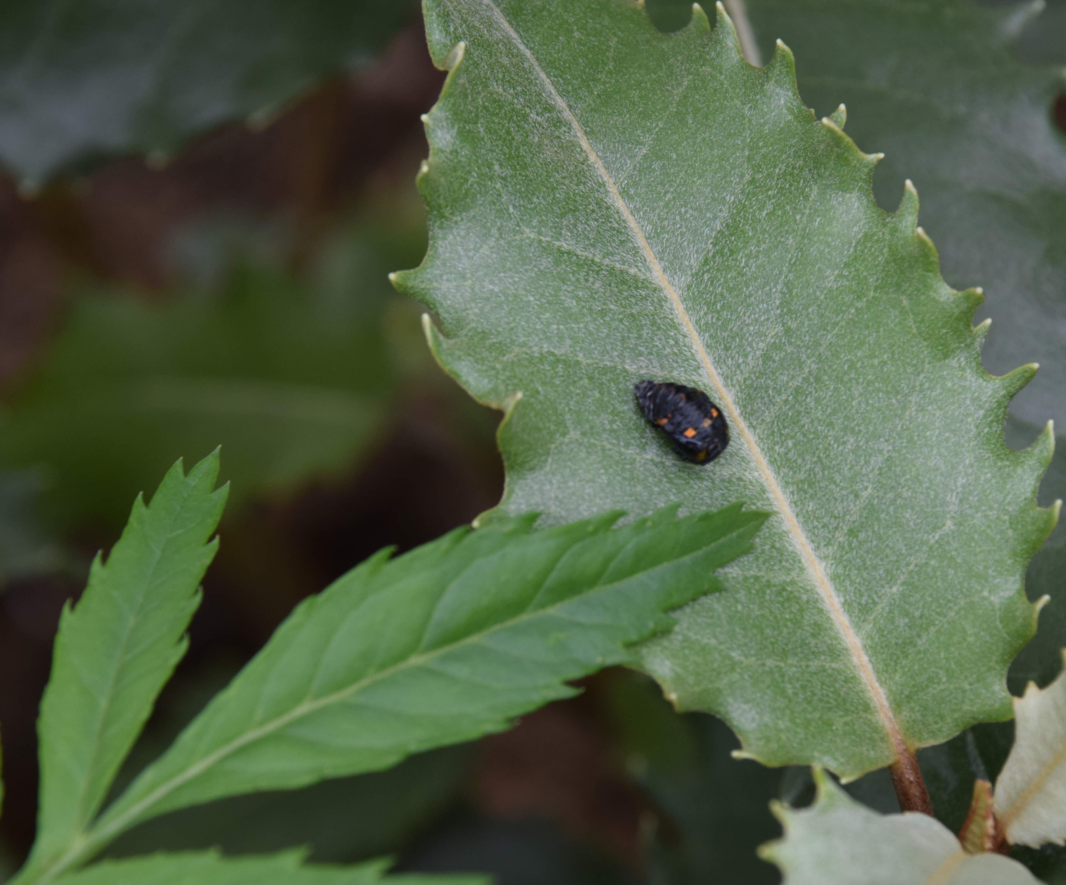 It sometimes seems as though every insect in the garden is a pest. So I am always so pleased to see ladybirds. Everyone knows what the adults look like but the crocodile-like larvae are less familiar. I have written about them before so you can check back so I don’t repeat myself. Even so I was pleased to see a pupa on an olearia leaf when I was staking the sunflowers that had collapsed under the weight of rain earlier in the week. They may look like something unpleasant but they will soon split open and out will run an aphid-munching machine.