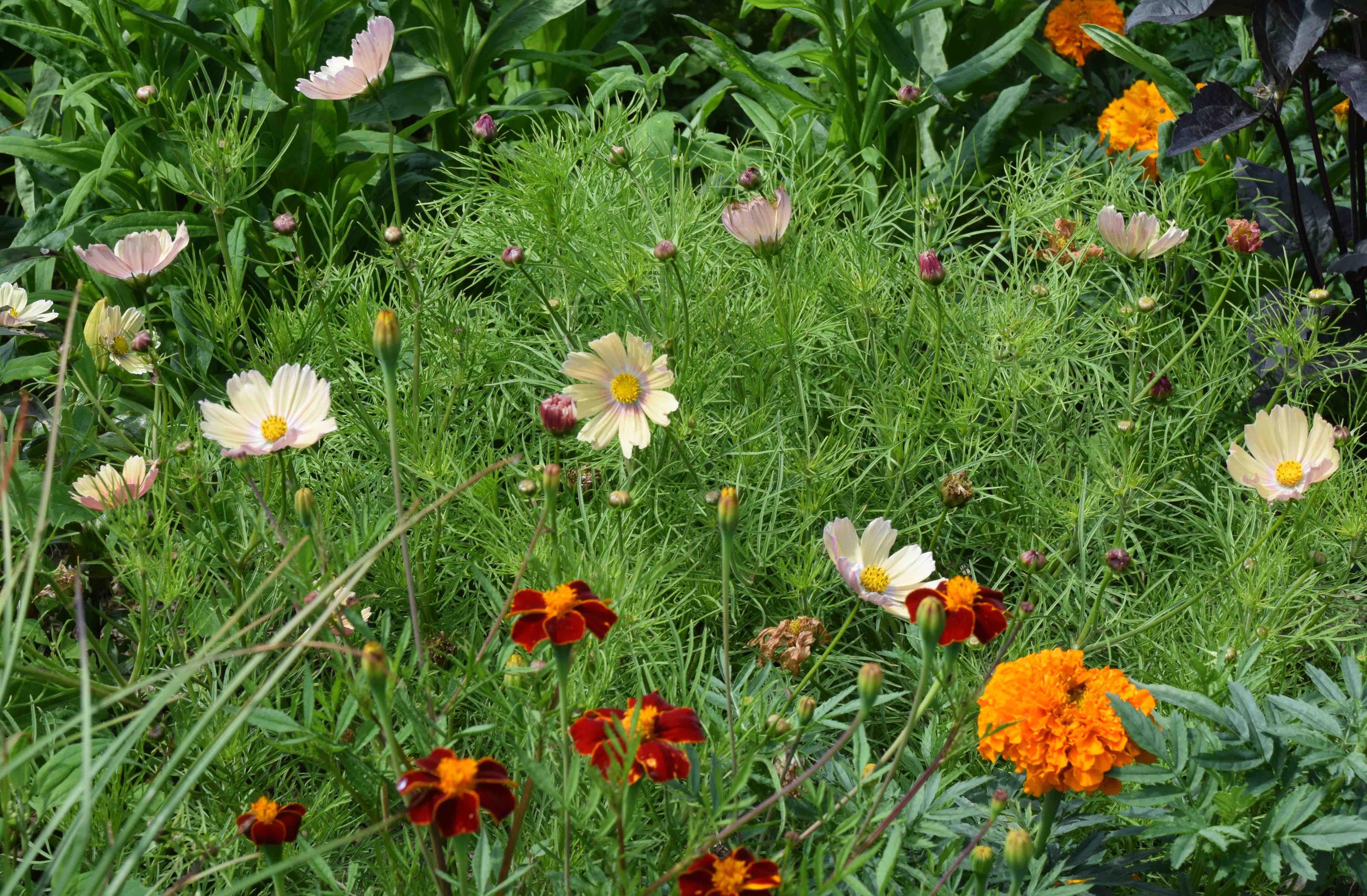 The only annuals I grow, in quantity, every year, are cosmos. The taller kinds are good fillers for new gardens and they bloom for months. The large seeds germinate quickly, the seedlings are quick and easy to grow and the plants and flowers withstand all weathers, though the taller kinds can get felled in windy autumn weather. In the past there were two main types; the tall, and pink, C. bipinnatus kinds and the yellow and orange, smaller and warmth-loving C. sulphureus kinds. Things are getting more complex as the two have been hybridised and we now have (pale) yellow ‘bipinnatus’ kinds such as ‘Xanthos’.