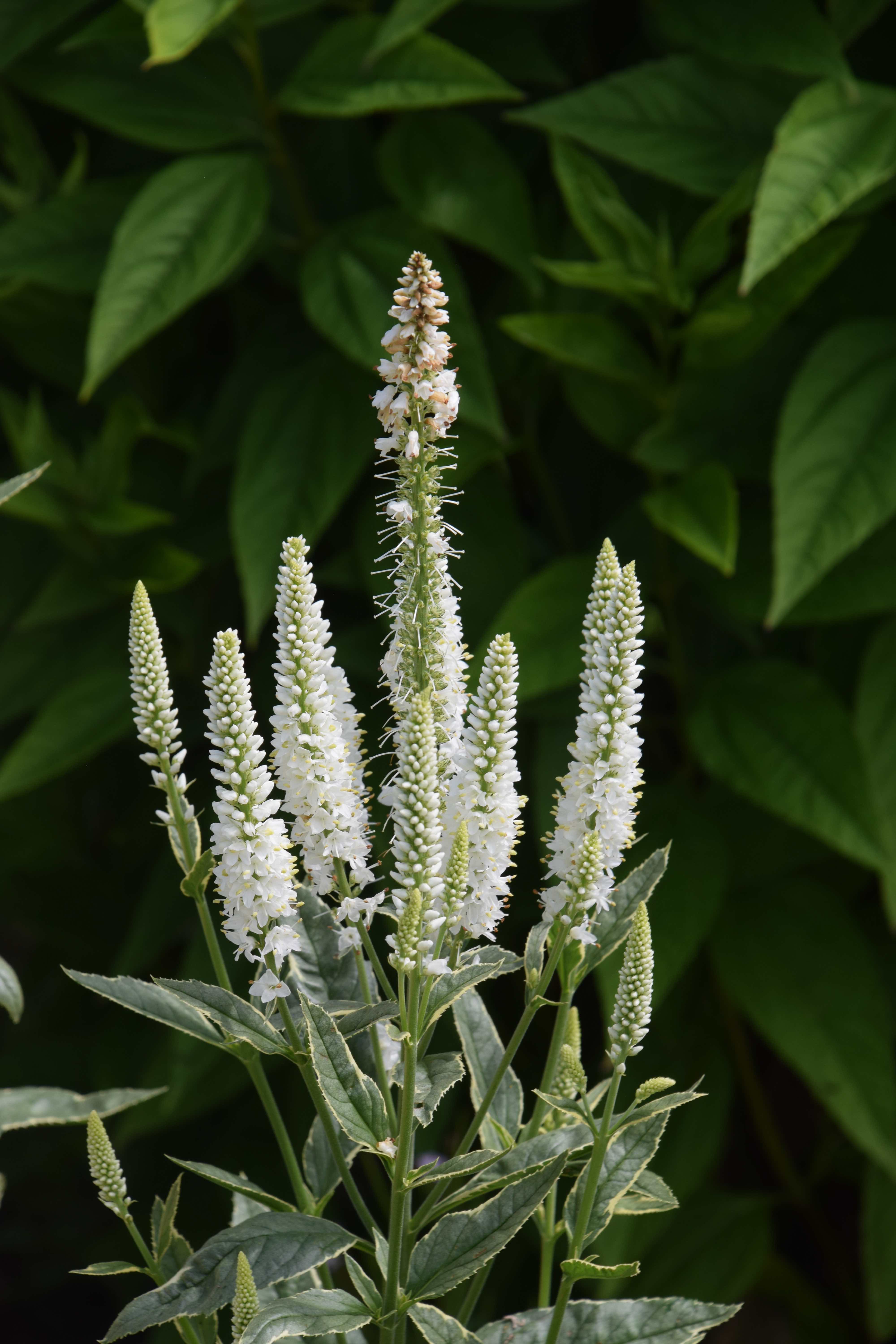 I will keep the verbage short for Veronica longifolia ‘Charlotte’, having written too much already. This is a ‘relatively’ recent introduction and has upright stems with narrow leaves, edged in creamy white and long heads of tiny white flowers. It has a lot going for it. It is tall (70cm) and rather narrow so does not take up too much space. It has not needed staking so far. Crucial, for me, is the fact that the flowers drop as they fade so the clump is not ruined by brown dead flowers, which I hate.